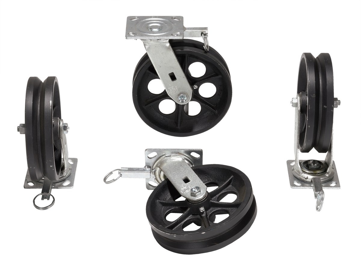Cast Iron Swivel V-Groove Casters With 4-Position Lock 8 In. x 2 In. For Aluminum Gantry Crane ModelsThe v groove caster is a great addition to the gantry crane. The design allows the unit to be utilized on a stable track for precise positioning. Simple installation with the pre drilled mounting holes.
