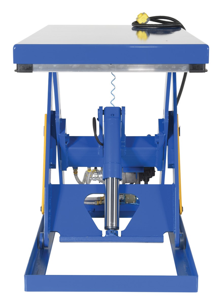 Steel Rotary Air Hydraulic Scissor Lift Table 30 In. x 60 In. 3,000 Lb. Capacity BlueThe rotary air/Hydraulic scissor lift table utilizes the convenience of factory air to power the lift table. Simply connect to an air supply through a filter, regulator, lubricator, and you will have a lift table suitable for a wide range of applications and operating environments. It features a pneumatic upper travel limit switch, safety toe guards, cylinder with internal safety velocity fuse, two button hand control, and life-time lubricated sleeve bearings.
