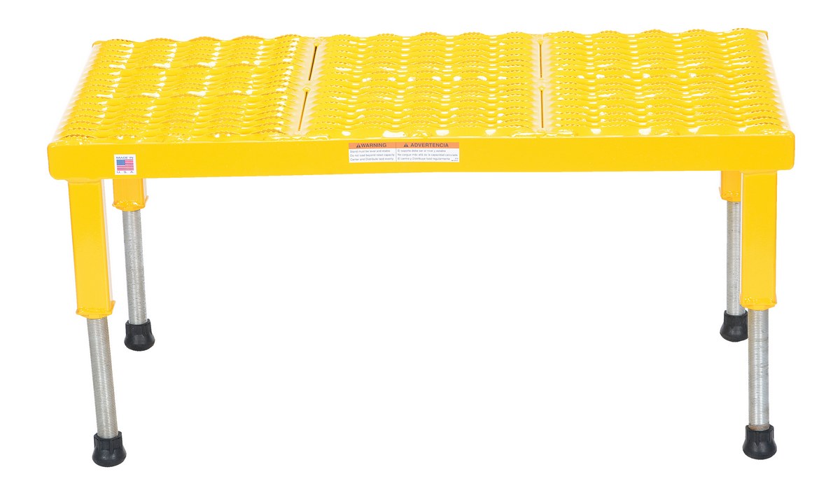 Steel Adjustable Work-Mate Stand 35-1/4 In. x 19-9/16 In. x 10-1/2 In. 500 Lb. Capacity YellowThe adjustable work-mate stand minimizes fatigue by elevating workers to heights that are comfortable and ergonomically correct. Especially useful when multiple shift employees operate the same piece of machinery. The height of each leg can be adjusted individually to ensure proper working height.