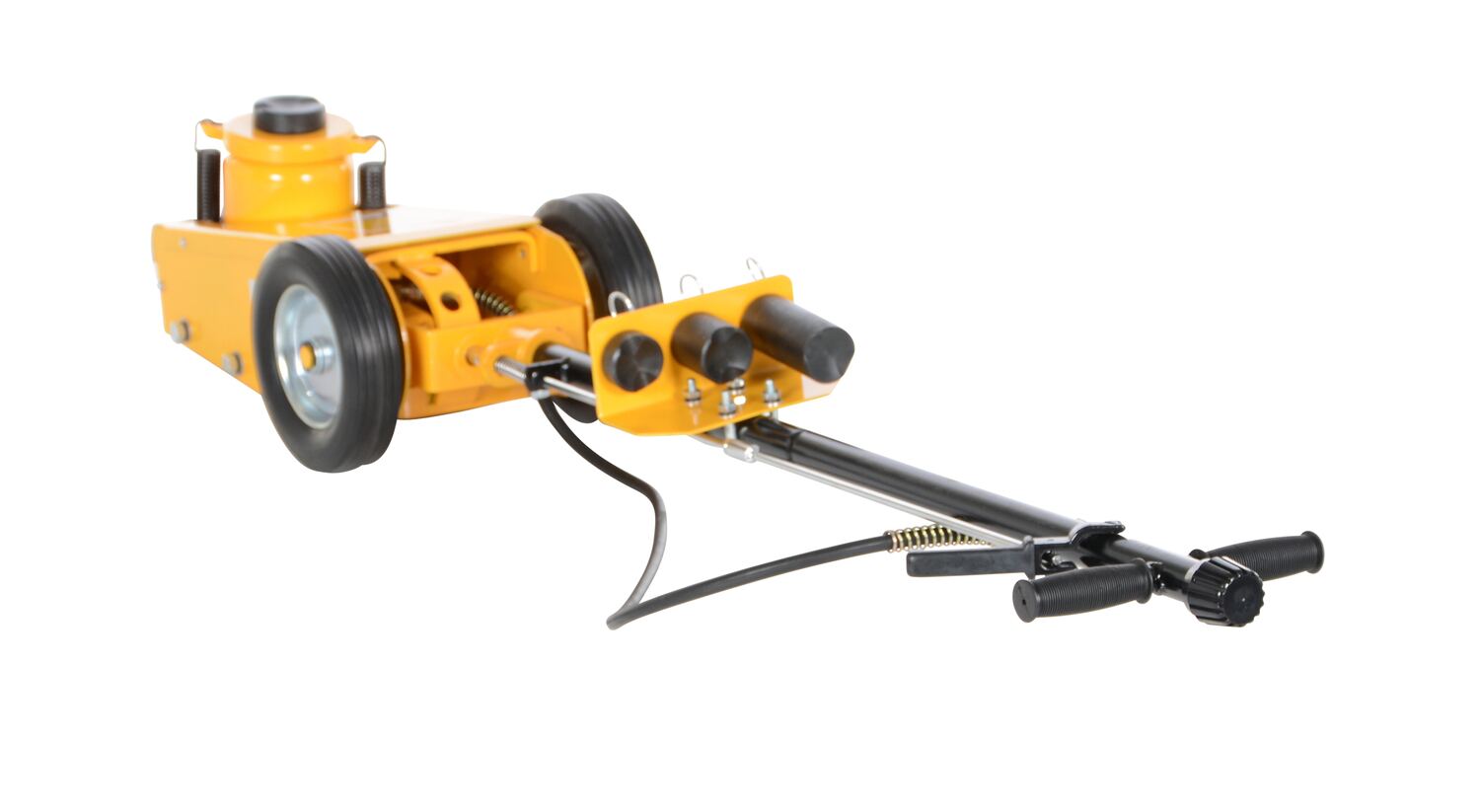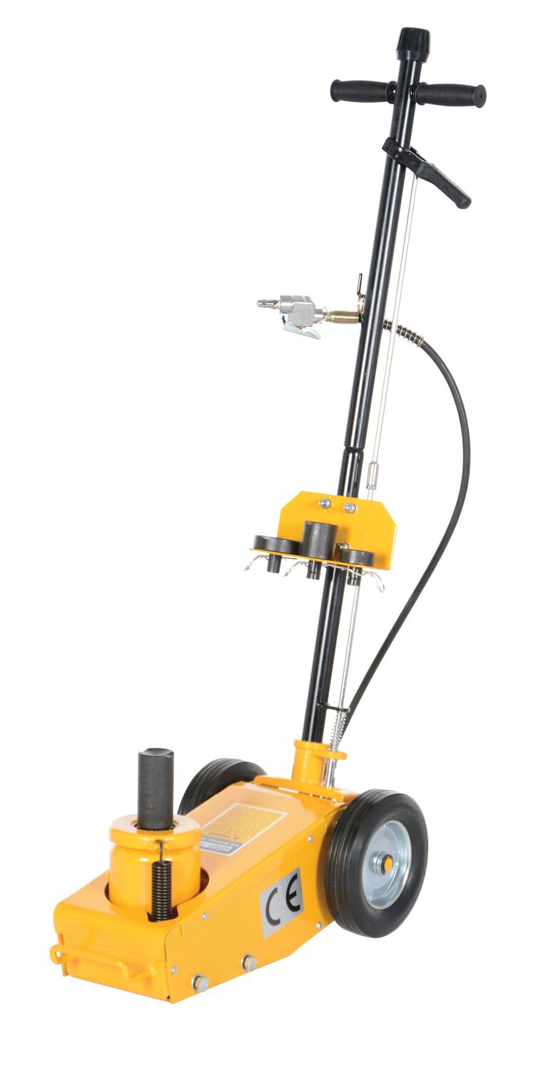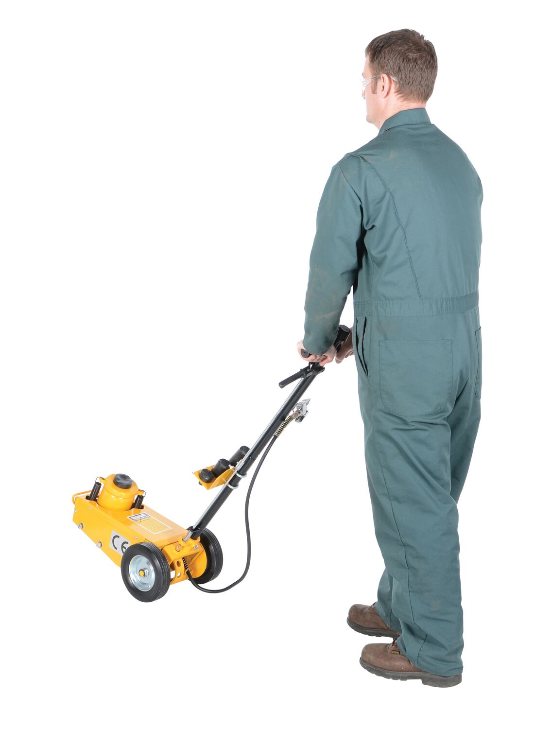 The air powered Fork Truck jack has an air-assist motor that quickly raises saddle to lift point and then lifts load to desired height. The air power allows for quick and easy operation. Unit uses standard coupler hook-up to a shop air compressor with air regulator control lever handle. Pressure relief valve is located on top of handle for metered control and load height adjustment.