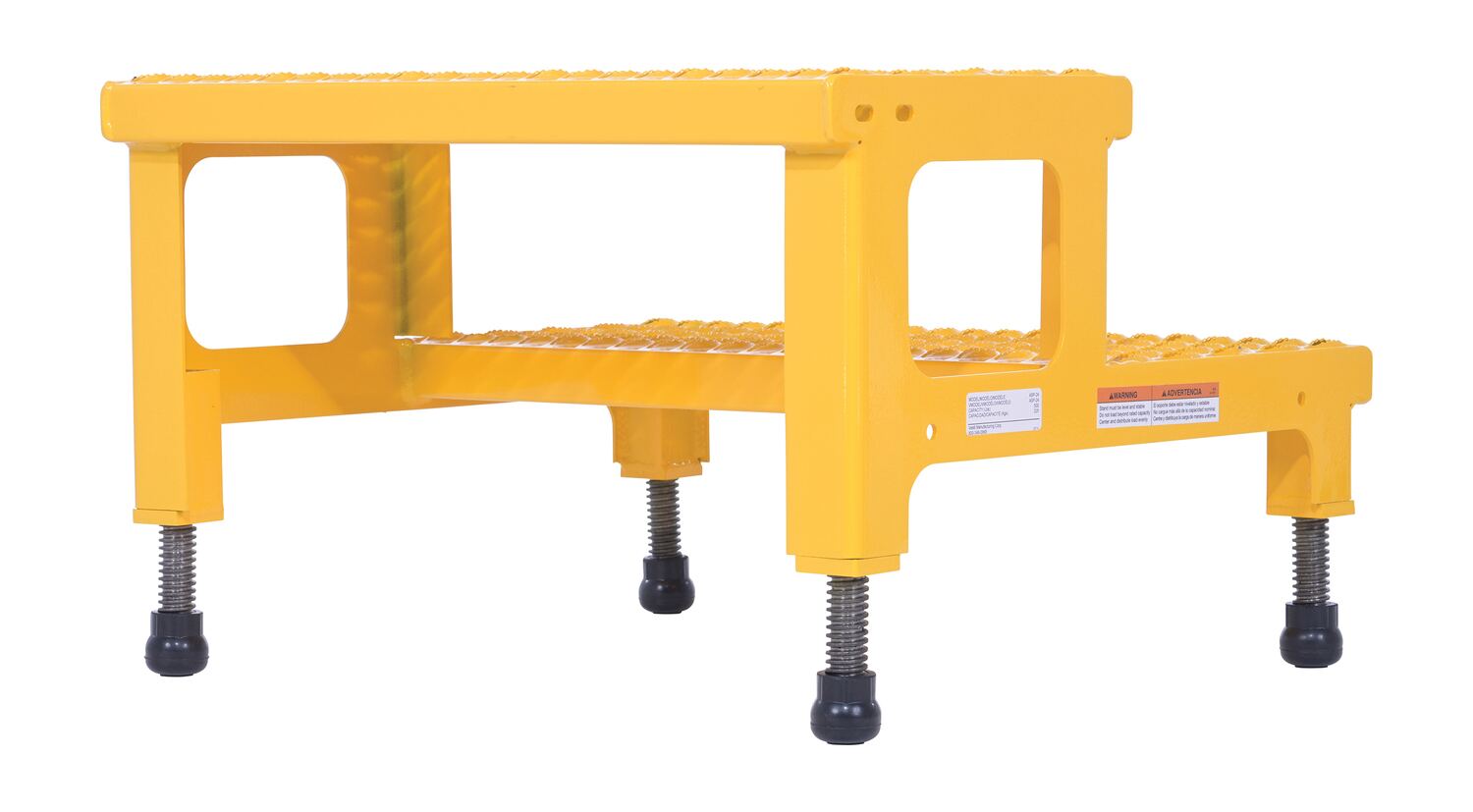 Steel Adjustable Step Mate Stand 2 Step 22-7/8 In. x 23-13/16 In. x 15-1/4 In. 500 Lb. Capacity YellowThe adjustable step-mate stand can be used as either a comfortable worker platform or a semi-permanent step. The serrated surface ensures safe footing. The legs adjust individually by screwing them into or out of the leg base.