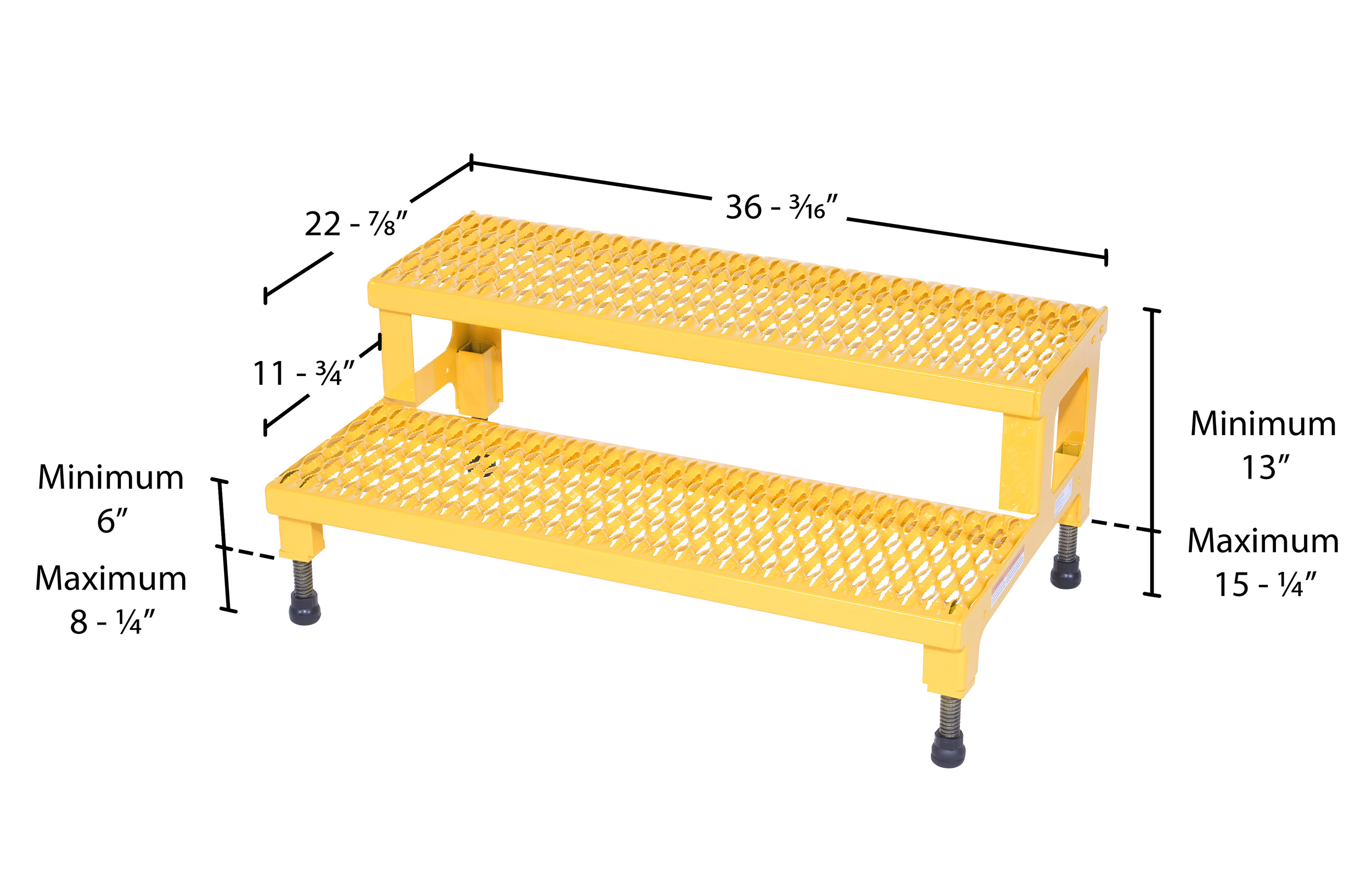 Steel Adjustable Step Mate Stand 2 Step 22-7/8 In. x 36-3/16 In. x 15-1/4 In. 500 Lb. Capacity YellowThe adjustable step-mate stand can be used as either a comfortable worker platform or a semi-permanent step. The serrated surface ensures safe footing. The legs adjust individually by screwing them into or out of the leg base.