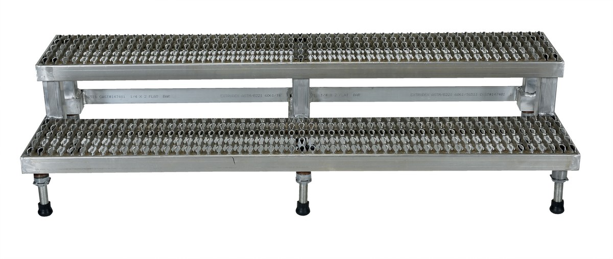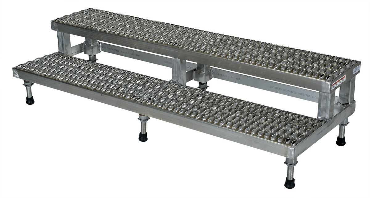 Aluminum Adjustable Step Mate Stand 2 Step 22-3/4 In. x 60-1/8 In. x 14-1/2 In. 500 Lb. Capacity SilverThe adjustable step-mate stand can be used as either a comfortable worker platform or a semi-permanent step. The serrated surface ensures safe footing. The legs adjust individually by screwing them into or out of the leg base.
