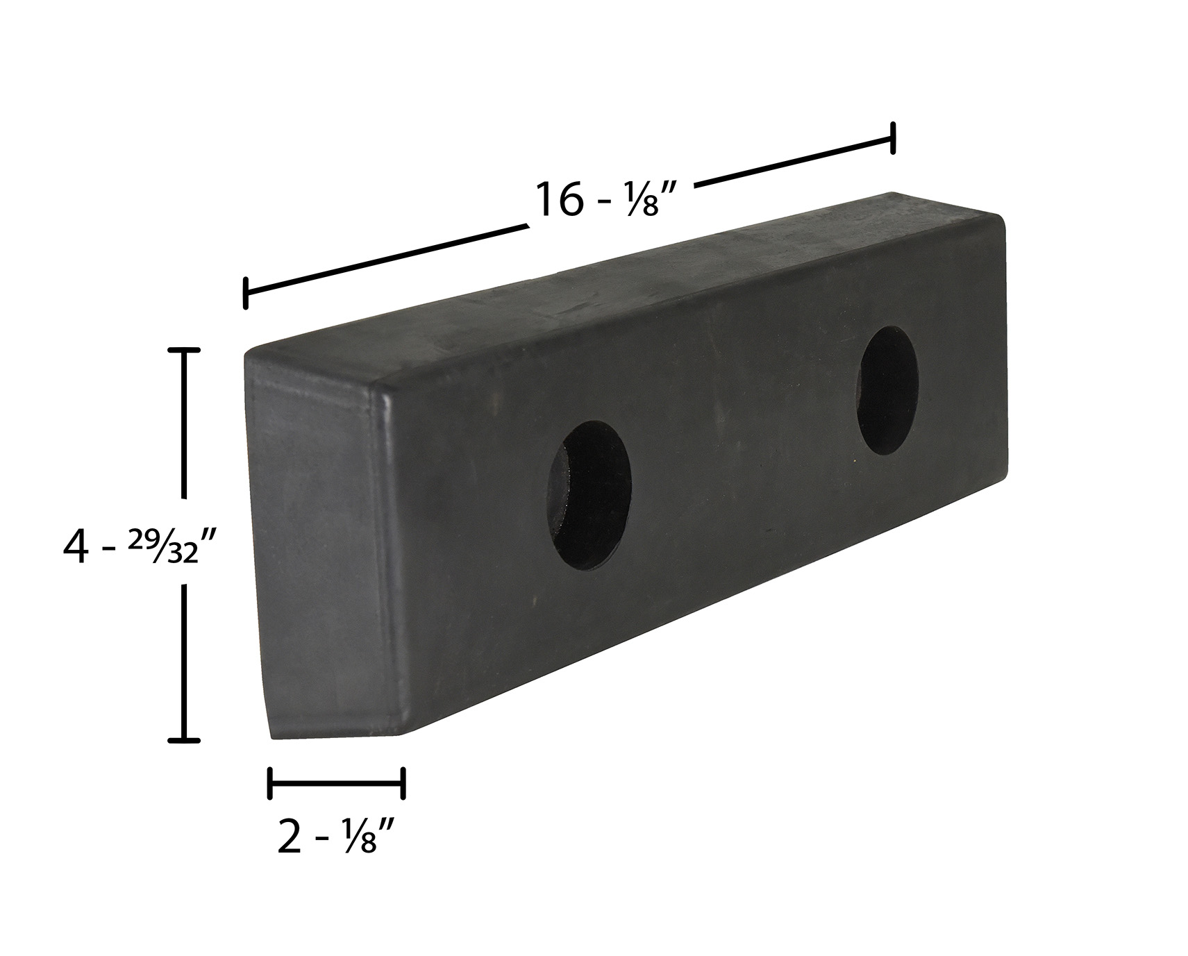 Rubber Rectangle Molded Bumper 16-1/8 In. x 4-29/32 In. x 2-1/8 In. BlackThe specialty molded Dock Bumper is manufactured from fiber reinforced prime rubber containing nylon and polyester. This molded bumper is built to endure years of abusive pounding and has pre-drilled countersunk mounting holes for easy installation. Bumper offers a plastic face bumper that features a two (2) piece construction fully assembled and ready for installation. The installation hardware is available separately.