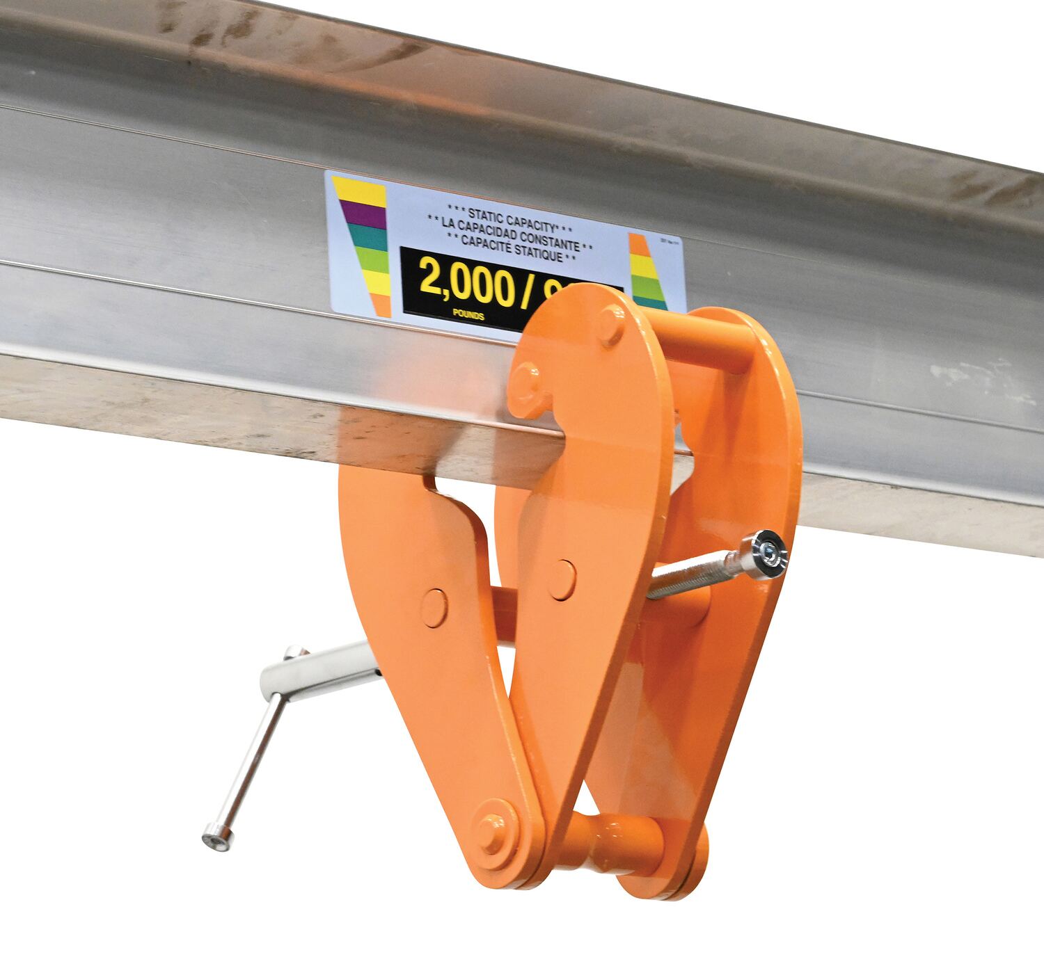 The beam clamp is designed to reduce the I-beam flange stress by distributing loads away from the flange edges during overhead lifting applications. This versatile unit can be interchanged from one gantry to another in a matter of seconds. A bar is located at the bottom of the beam clamp for attaching a hoist (sold separately). Painted finish.