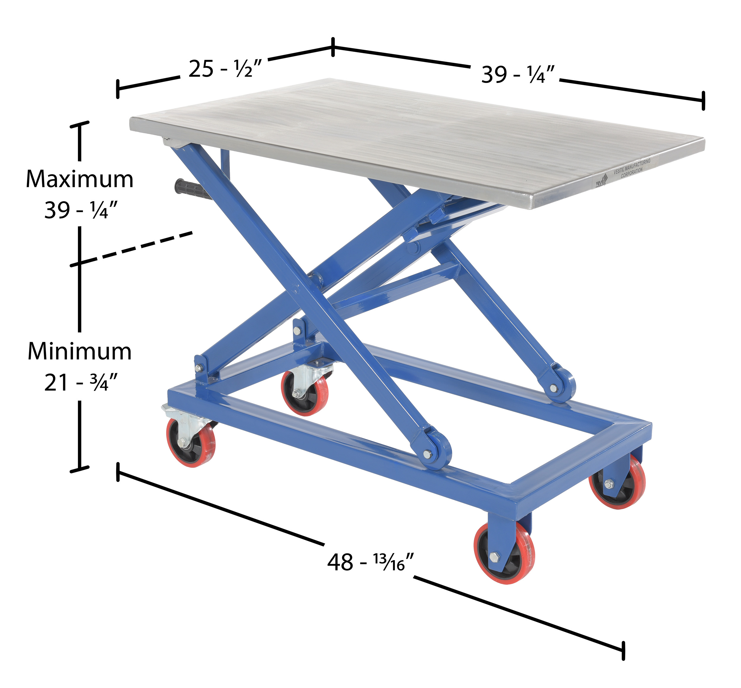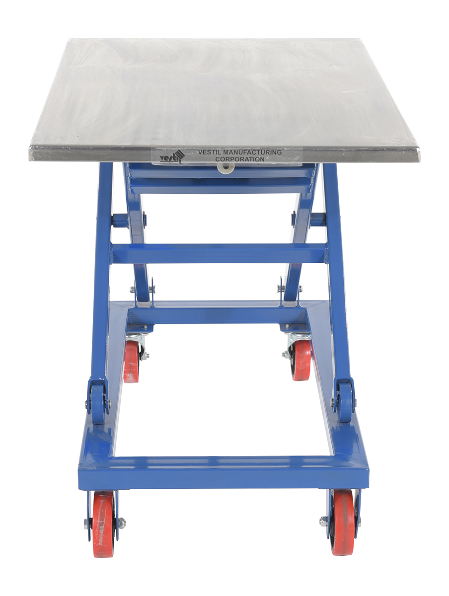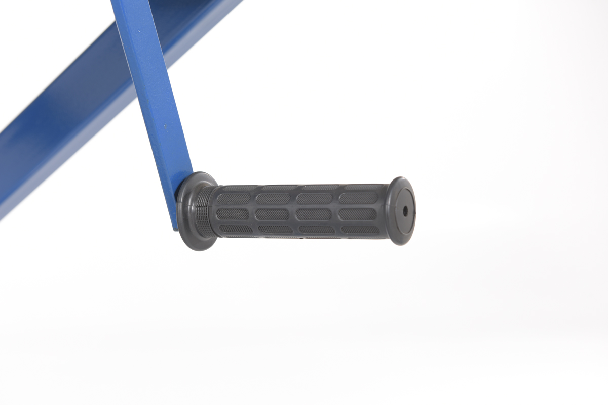 Steel Mechanical Scissor Cart 25-1/2 In. x 39-1/4 1000 Lb. Capacity BlueWhen lifting and transporting are both essential, look no further than the mechanical scissor cart. The centrally located hand crank allows the user to raise and lower the platform to a more exact level. A large platform gives the ability to load items in a variety of sizes. Since the platform can be maneuvered to a specific height, the unit can be positioned to best fit the users needs for a more ergonomically friendly experience. Poly casters are included for a smooth roll on a variety of surfaces.