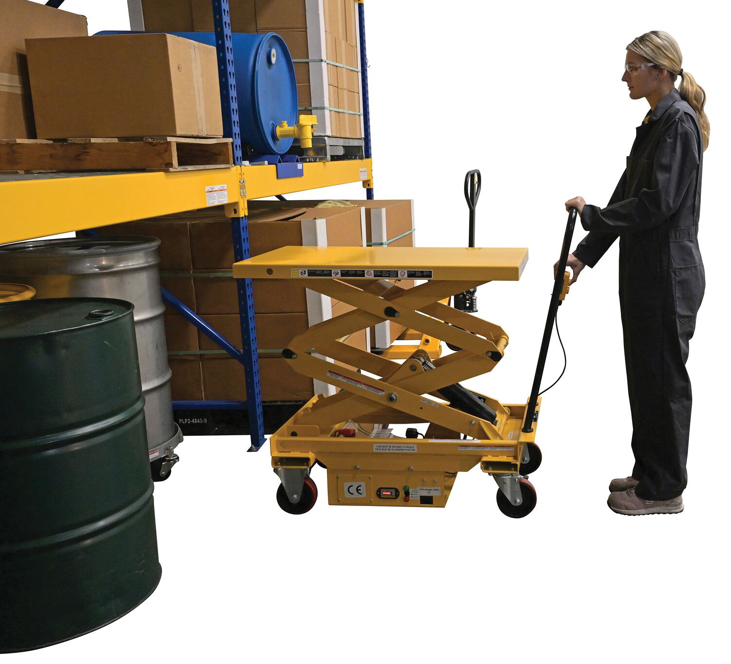 Steel DC Powered Hydraulic Double Scissor Cart 20-1/2 In. x 39-3/4 In. 1000 Lb. Capacity YellowThe DC powered Hydraulic elevating cart is ideal for quick lifting and ergonomic material handling. The battery-powered unit allows operators to raise and lower platform with the push of a button. The unit rolls on two rigid and two swivel polyurethane casters. It includes battery, on-board battery charger and battery charge indicator gauge. Features an internal safety velocity fuse in each cylinder.
