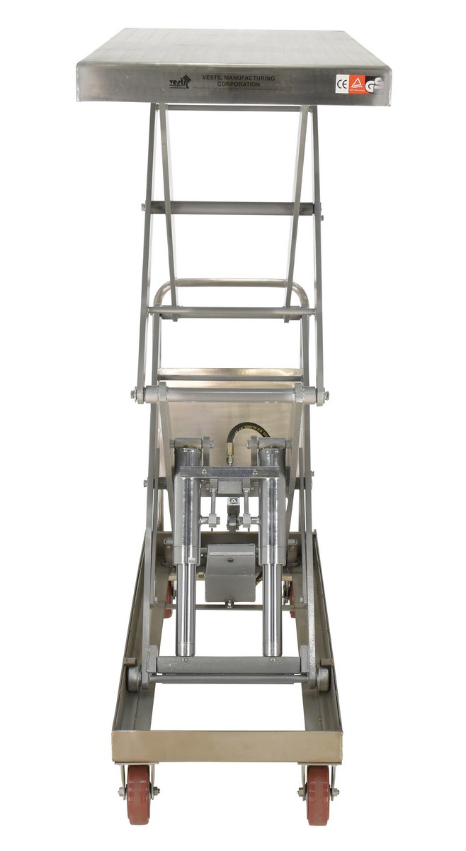 The partially Stainless Steel Hydraulic elevating cart is available for transport heavy loads in lab, food service and health care applications. Not suitable for wash-down applications. The platform, handle, base frame, caster rigs, and hardware are 304 grade stainless steel. The wheels are poly-on-poly. Features an internal safety velocity fuse in each cylinder.