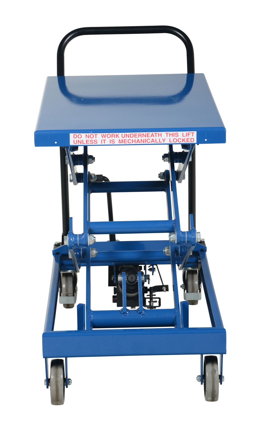 Steel Premium Double Scissor Cart with Foot Release 19.5 In. x 33 In. 300 Lb. Capacity BlueThe premium scissor lift cart is constructed of heavy duty steel and designed to withstand the most demanding industrial environments. The simplicity and compactness of these products make them ideal for lifting and transporting loads, order-picking, die handling, and for use in support of assembly operations. There is little exertion required to raise and lower the deck due to the high quality foot-actuated, single speed hydraulic pump. The hydraulic system is equipped with an overload protection valve. Each cart has safety stops to prevent an empty deck from lowering while performing maintenance. A unique tilt-up table top allows for safe and easy maintenance. The two rigid front casters and two rear swivel polyurethane casters with brake provide a high degree of maneuverability; each swivel wheel is protected by guards and is equipped with brakes.