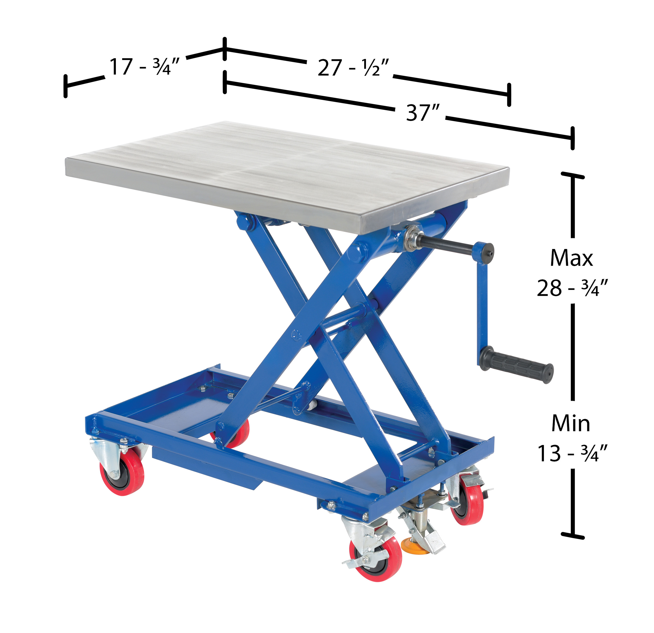 Steel Mechanical Scissor Cart with Hand Crank 17-3/4 In. x 27-1/2 In. 330 Lb. Capacity Blue/SilverWhen lifting and transporting are both essential, look no further than the mechanical scissor cart. The centrally located hand crank allows the user to raise and lower the platform to a more exact level. A large platform gives the ability to load items in a variety of sizes. Since the platform can be maneuvered to a specific height, the unit can be positioned to best fit the users needs for a more ergonomically friendly experience. Poly casters are included for a smooth roll on a variety of surfaces.