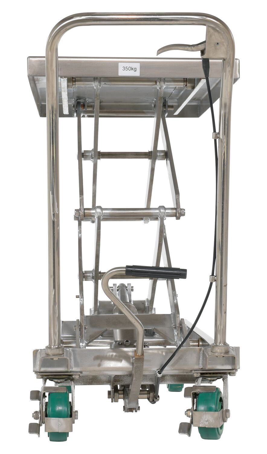 304 Stainless Steel Double Scissor Cart 36-1/4 In. x 19-3/8 In. 600 Lb. Capacity SilverThe premium scissor lift cart is constructed of heavy duty steel and designed to withstand the most demanding industrial environments. The simplicity and compactness of these products make them ideal for lifting and transporting loads, order-picking, die handling, and for use in support of assembly operations. There is little exertion required to maneuver the deck due to the high quality foot-actuated, single speed hydraulic pump for raising . A unique tilt-up table top allows for safe and easy maintenance.