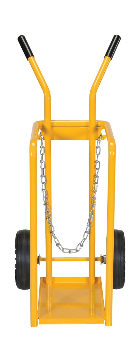 Steel Welding Cylinder Hand Truck 23-7/8 In. x 17-3/4 In. x 40-11/16 In. 150 Lb. Capacity YellowIdeal for transporting cylinders from storage to work space. Capable of handling two 9" cylinders. Chains provide utmost safety. Tilt back design for effortless transportation.