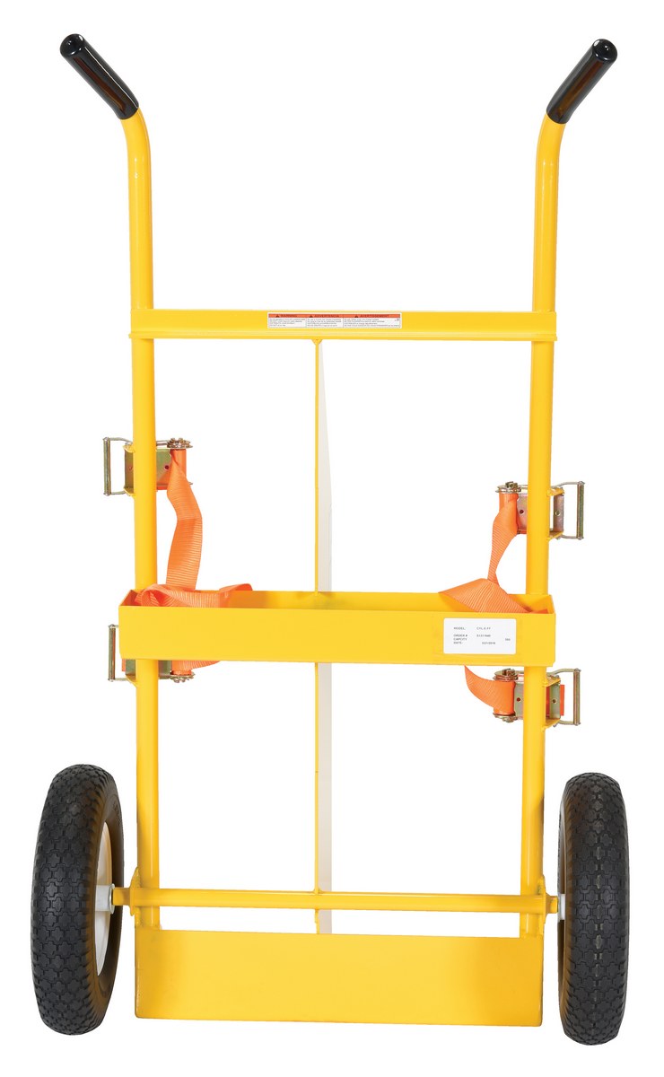 Steel Cylinder Torch Cart with Foam Filled Wheels 22-13/16 In. x 34-1/2 In. x 57 In. 500 Lb. Capacity YellowThe welding Cylinder torch cart is designed for transporting cylinders and cutting torch. Includes two (2) tank compartments with heavy-duty ratchet straps. Convenient open-top storage tray. Sturdy handles and large wheels for tilt-n-go portability. Welded steel construction with powder coat finish. Not designed for use as a storage means for gas cylinders.