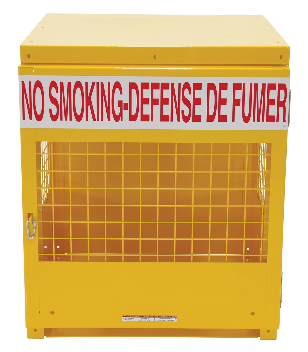 Steel Canadian LP Cylinder Storage Cabinet 32 In. x 30 In. x 35-1/2 In. 4 Cylinder CapacityDurable steel cabinet for storage of LP style cylinders. Cylinder storage capacity is based on cylinder size. Sides and door are made of expanded steel mesh. Bottom, back and top are made of solid sheet steel. Lockable doors protect cylinders (padlock not included). Base includes lag holes for securing unit to floor (hardware is not included). Rugged welded steel construction with safety yellow finish. Cabinet ships fully assembled.