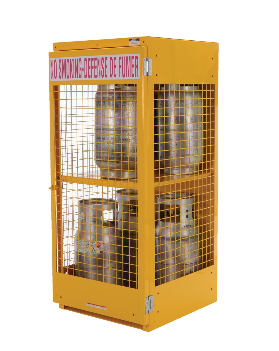 Steel Canadian LP Cylinder Storage Cabinet 32 In. x 30 In. x 68-1/4 In. 8 Cylinder CapacityDurable steel cabinet for storage of LP style cylinders. Cylinder storage capacity is based on cylinder size. Sides and door are made of expanded steel mesh. Bottom, back and top are made of solid sheet steel. Lockable doors protect cylinders (padlock not included). Base includes lag holes for securing unit to floor (hardware is not included). Rugged welded steel construction with safety yellow finish. Cabinet ships fully assembled.