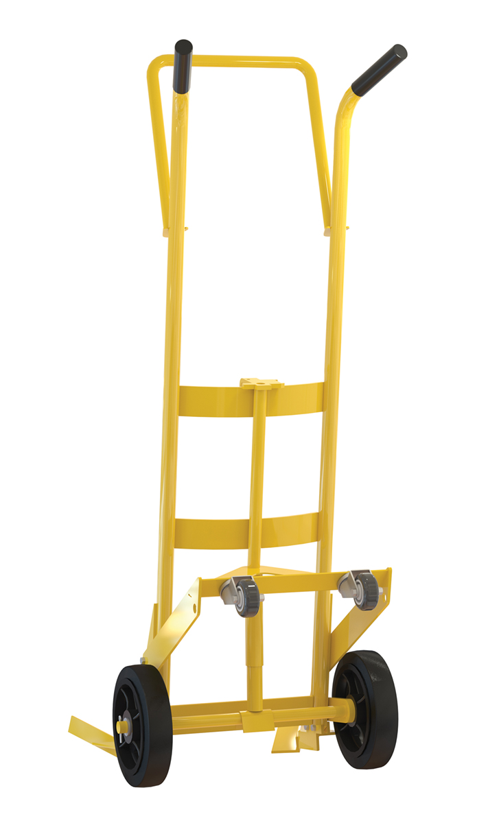 Designed for moving 55 gallon plastic drums. Features a spring mechanism, which allows for easier tilting of fully-loaded drums. Four-wheel design for easier drum transportation when tilted. Top loop handle allows for easier control when moving. Drum is secured to truck with an adjustable height drum hook bar. Removable drum hook bar includes built-in bung nut wrenches. Capacity is 1,000 pounds. Steel construction with powder coat finish.