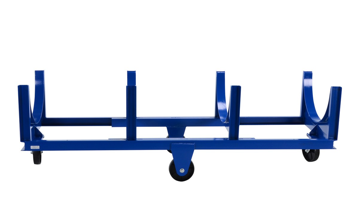 Steel Heavy Duty Cradle 96-5/16 In. x 31-1/2 In. x 30 In. 4000 Lb. Capacity BlueMove and store pipe, channel, bar stock, barrels, or drums with this Heavy Duty cradle cart. A large open design that makes loading and unloading by fork trucks and slings easy. All welded construction. Wheels are mounted in a diamond pattern to allow the truck to tilt when going over thresholds and turn about on its own center. Lightweight Aluminum cradle cart fits all small to medium loads. Powder coat finish standard on steel cart.