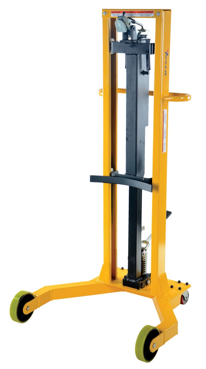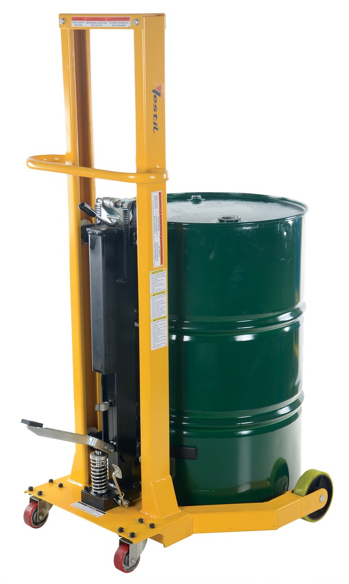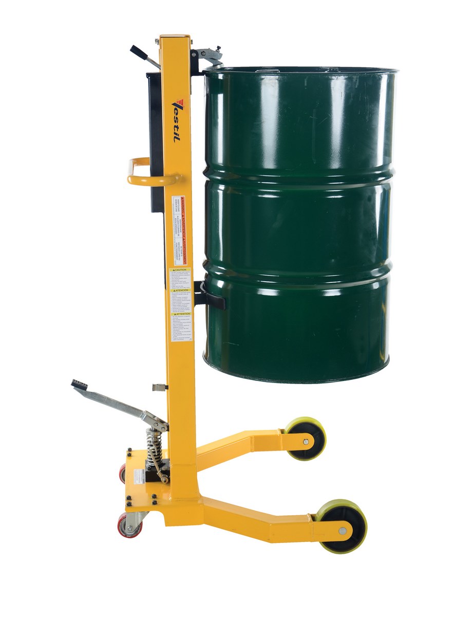 Steel Portable Drum Jack Accepts 55 Gallon Steel and Fiber Drums 500 Lb. Capacity YellowThis drum jack is the perfect solution to any of your drum transporting needs. Compact design allows for maximum maneuverability in restrictive areas. Accepts drums with a top lip. Includes rigid and swivel casters for portability, manual hydraulic foot pump to raise and lower the drum.