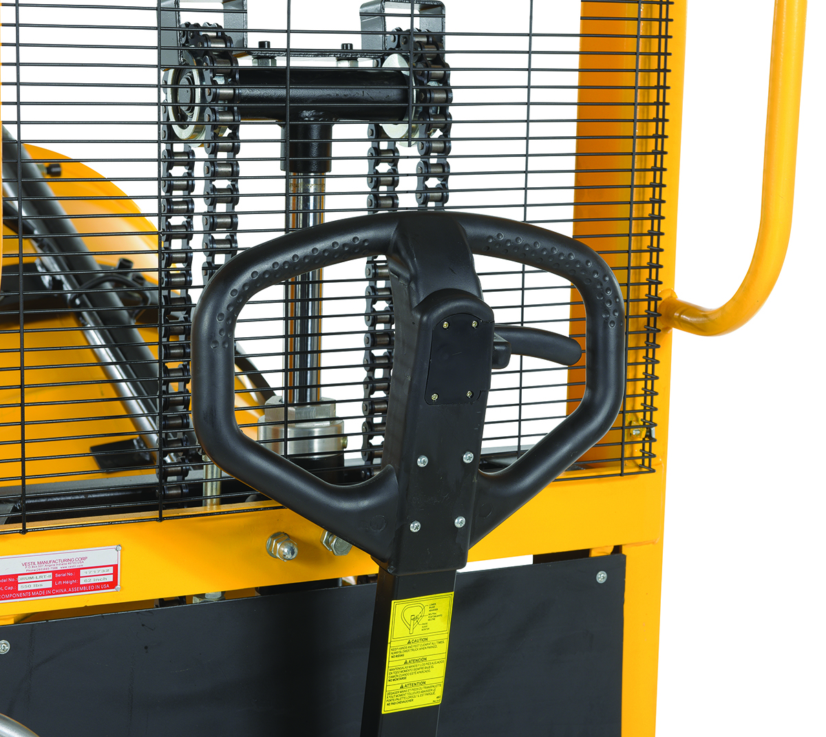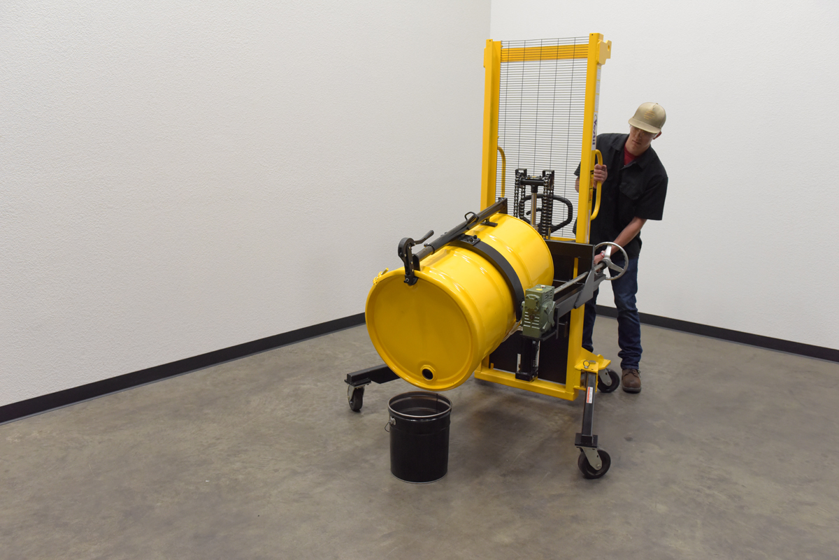 Steel Manual Drum Lifter/Rotator/Transport 51-1/2 In. x 34 In. x 82-5/8 In. 550 Lb. Capacity Yellow/BlackThe manual operation, portable Drum Lifter/rotator/transporter features pivoting straddle legs for access to drums on pallets. Legs will manually pivot and lock into place with locking pin.