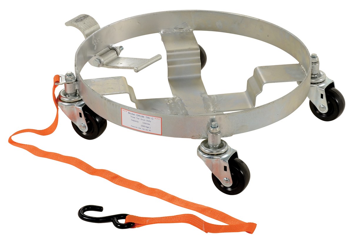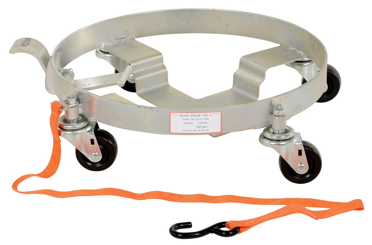 Steel Tilting Drum Dolly Three Tier 21-1/2 In. x 21-1/2 In. x 5-7/8 In. 1200 Lb. Capacity SilverTilting drum dolly tilts for better liquid extraction. Fits onto a variety of round steel drums tilting feature is foot-operated and locks into place when activated. This feature only works with the outside/biggest drum that the unit will accommodate. Patent pending.