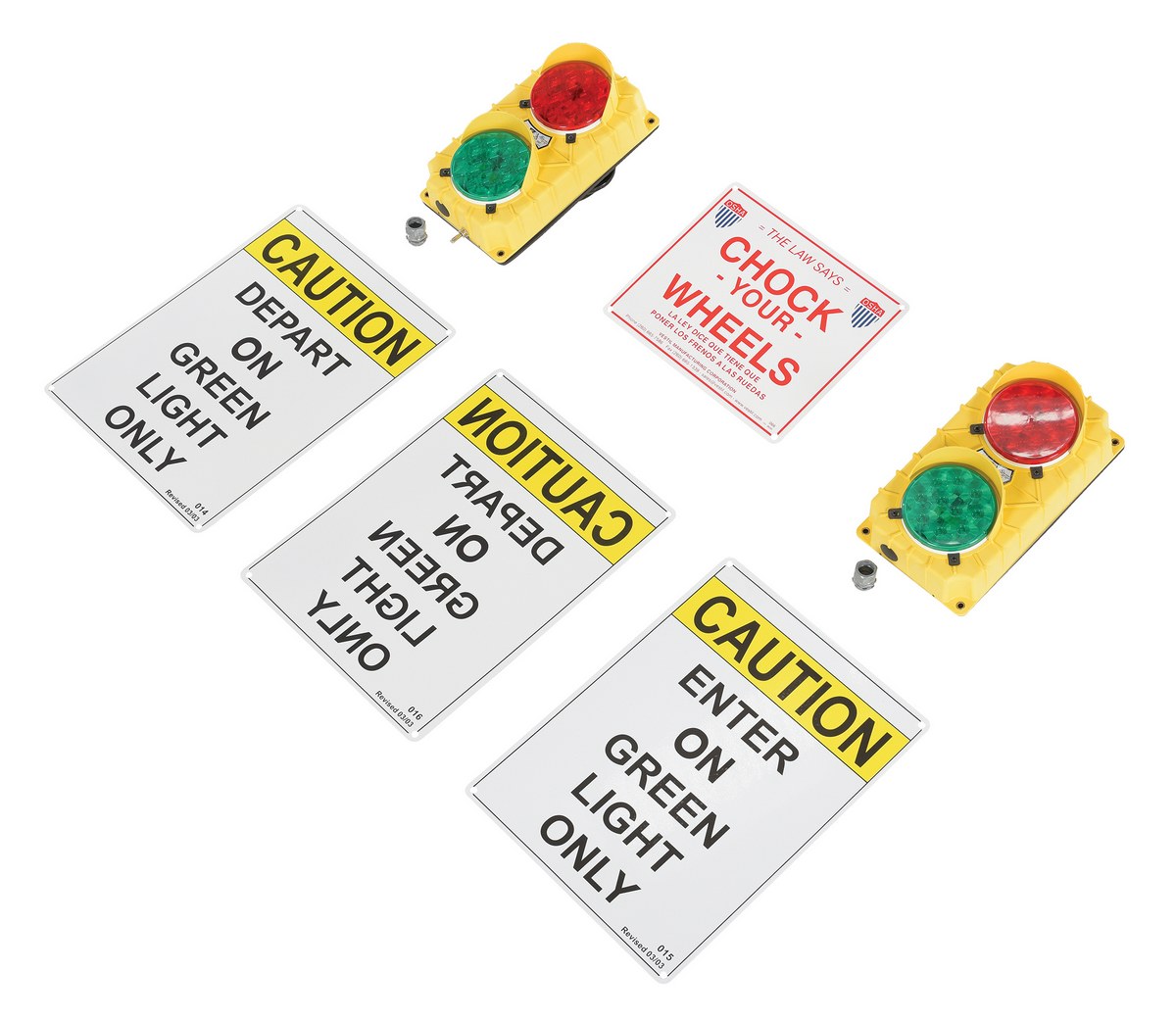 Polypropylene Traffic System Stop Go Set 24V LED 3-3/4 In. x 6-1/2 In. x 11-1/2 In. YellowOur dock traffic systems feature flashing red and green lights. Prevent accidents and injuries by providing clear communication between dock personnel and truck drivers. Built-in eyebrow type sun visors increase light visibility. Economy, model DTS-5, comes with two (2) yellow polypropylene traffic lights, 6."W x 11."H, each having a green and a red lens. The light containing a push button is placed inside the dock area for the dock attendant, and the other is placed outside for the truck driver. Four (4) signs are included. LED model never needs bulb replacements.