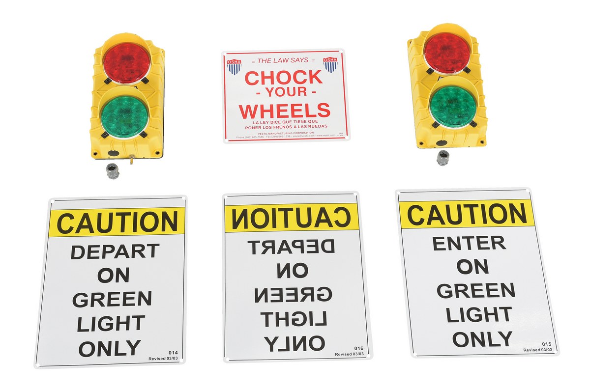 Our dock traffic systems feature flashing red and green lights. Prevent accidents and injuries by providing clear communication between dock personnel and truck drivers. Built-in eyebrow type sun visors increase light visibility. Economy, model DTS-5, comes with two (2) yellow polypropylene traffic lights, 6."W x 11."H, each having a green and a red lens. The light containing a push button is placed inside the dock area for the dock attendant, and the other is placed outside for the truck driver. Four (4) signs are included. LED model never needs bulb replacements.