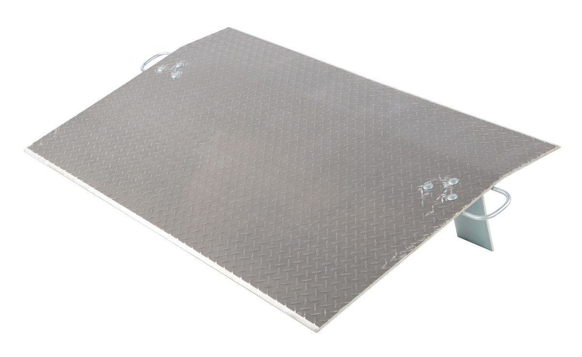 The aluminum economizer dock plate is an economical way to speed up truck loading and unloading. The unit spans the opening between dock and trailer to allow pallet or hand trucks along with traffic to safely move in and out of the trailer. The dock plate is constructed of high strength, non-skid aluminum alloy tread plate. The lightweight design with bolt on zinc plated legs and handles on each side makes portability easy. Locking legs for OSHA compliance. Not for use with fork trucks.