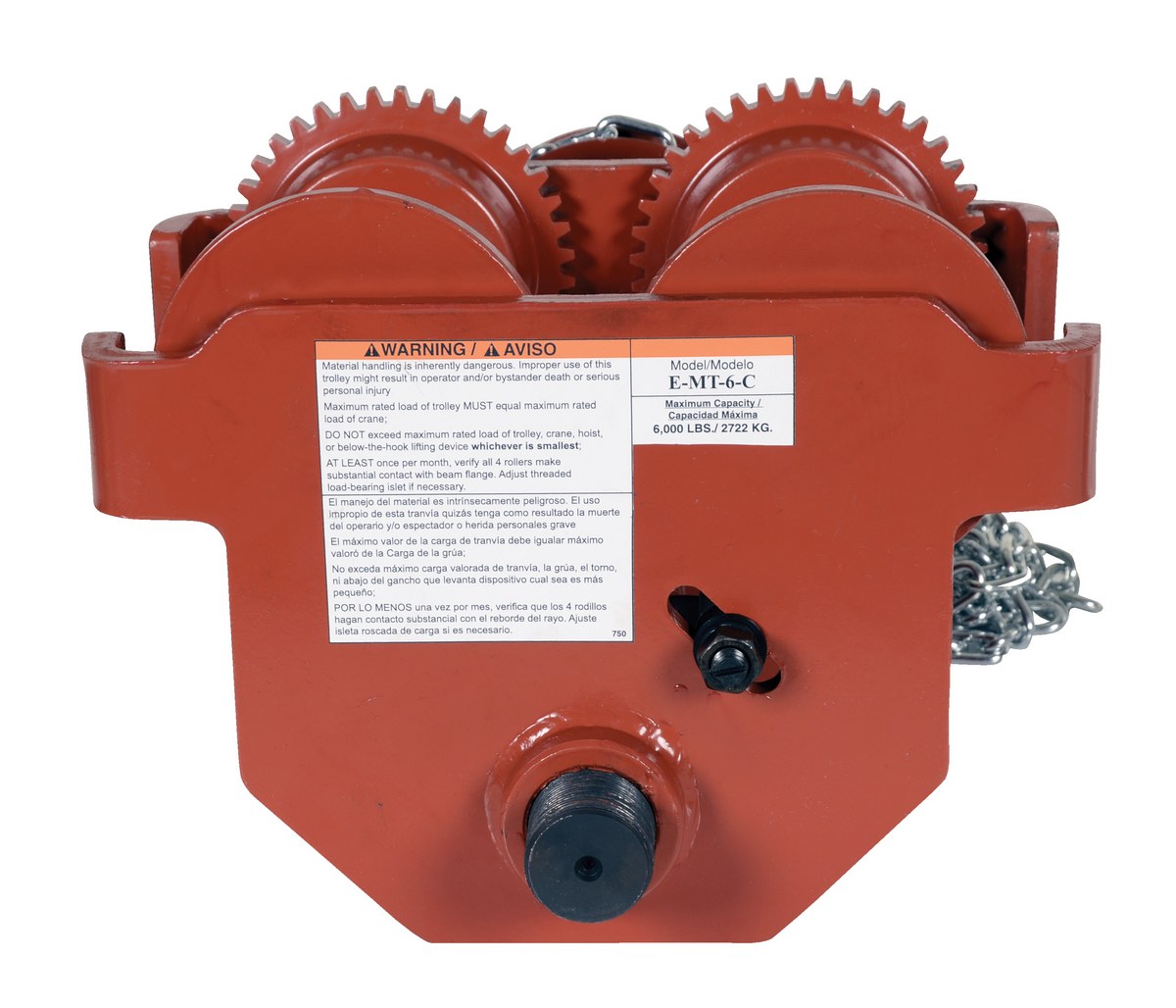 Steel Geared Eye Manual Trolley 6000 Lb. Capacity OrangeThis low profile manual trolley has been designed to quickly install on virtually any S, H, W and M type I-beam. The width of the trolley is adjusted by rotating the center rod with lifting eye clockwise or counterclockwise. Once the hoist (not included) is attached, the center rod cannot be rotated which prevents the trolley width from accidentally changing. This geared trolley is ideal for when precise positioning of the trolley is required. It includes four (4) rollers with sealed bearings for long life. A lifting eye is located at the bottom of the trolley for attaching a hoist (not included). The trolley features steel construction and a painted finish.