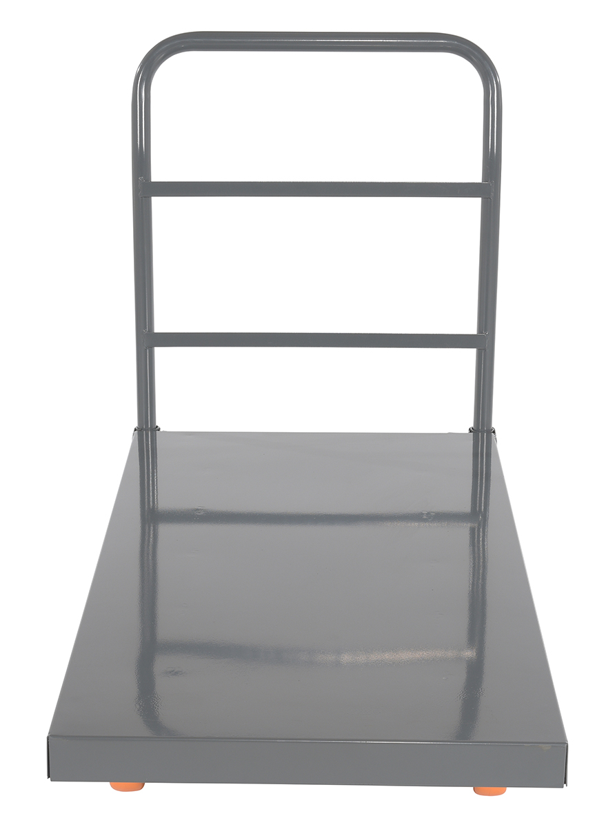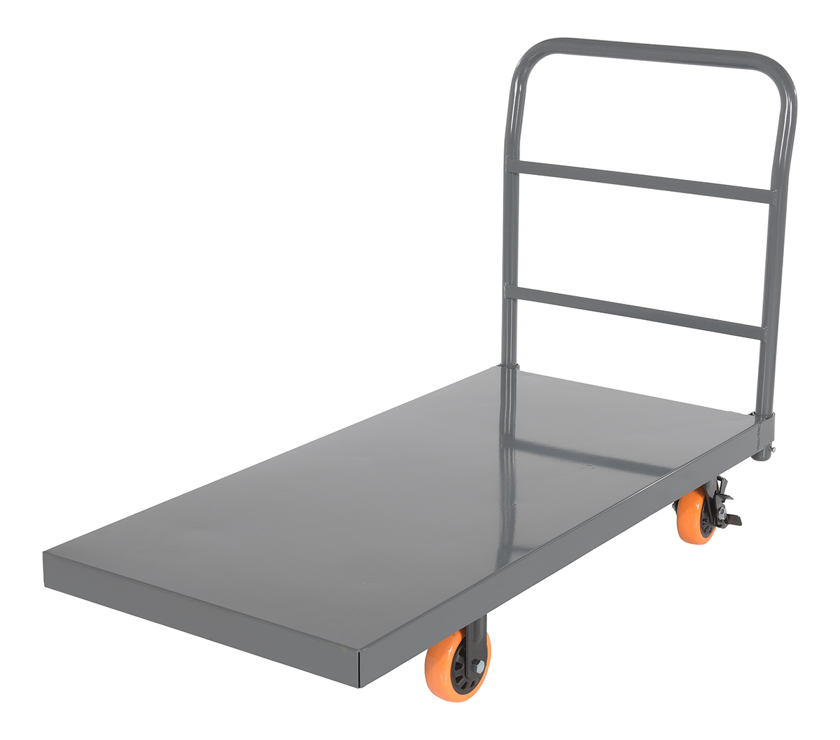 Steel Smooth Deck Platform Truck with 5 In. x 2 In. Poly Casters 45 In. x 45 In. x 39 In. 2500 Lb. Capacity Silver/OrangeThis steel platform truck with a solid, smooth steel deck is all welded and features structural reinforcement underneath for extra strength. It includes one (1) removable high-polished steel handle and rolls smoothly casters. Comes standard with a floor lock.