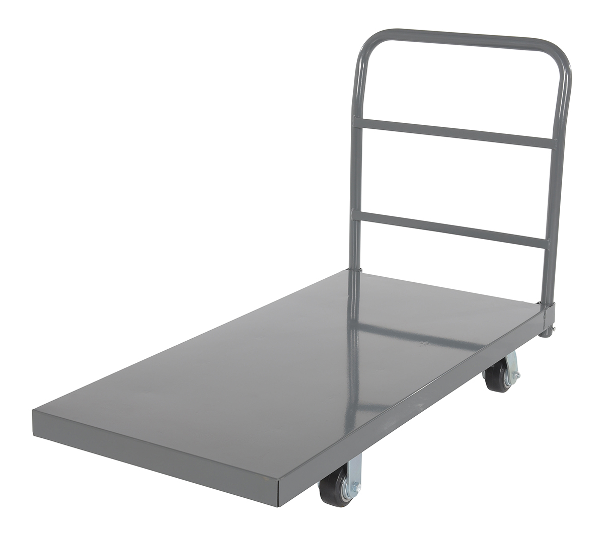 Steel Smooth Deck Platform Truck with 4 In. x 2 In. Mold On Rubber Casters 2000 Lb. Capacity GrayThis steel platform truck with a solid, smooth steel deck is all welded and features structural reinforcement underneath for extra strength. Includes one (1) removable high-polished steel handle and rolls smoothly casters. Comes standard with a floor lock.