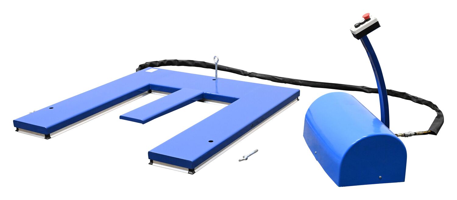 Steel Low Profile Electric Lift Table E Type 56 In. x 52-3/4 In. x 3-1/2 In. 2000 Lb. Capacity BlueThe low profile electric lift tables are ideal for manufacturing and distribution facilities. The unique, steel constructed "E" design provides a center support beam to prevent the lifted product from deflecting downward in the center. Numerous protective features include electric toe guards, velocity cylinders, and emergency stop buttons, providing personnel with the utmost safety. An external power pack is equipped with a pressure relief valve which prevents overloading while controlling lowering speed. To raise and lower the unit, simply utilize the "up and down" push button design on the 24V control box for precise ergonomic positioning of product.