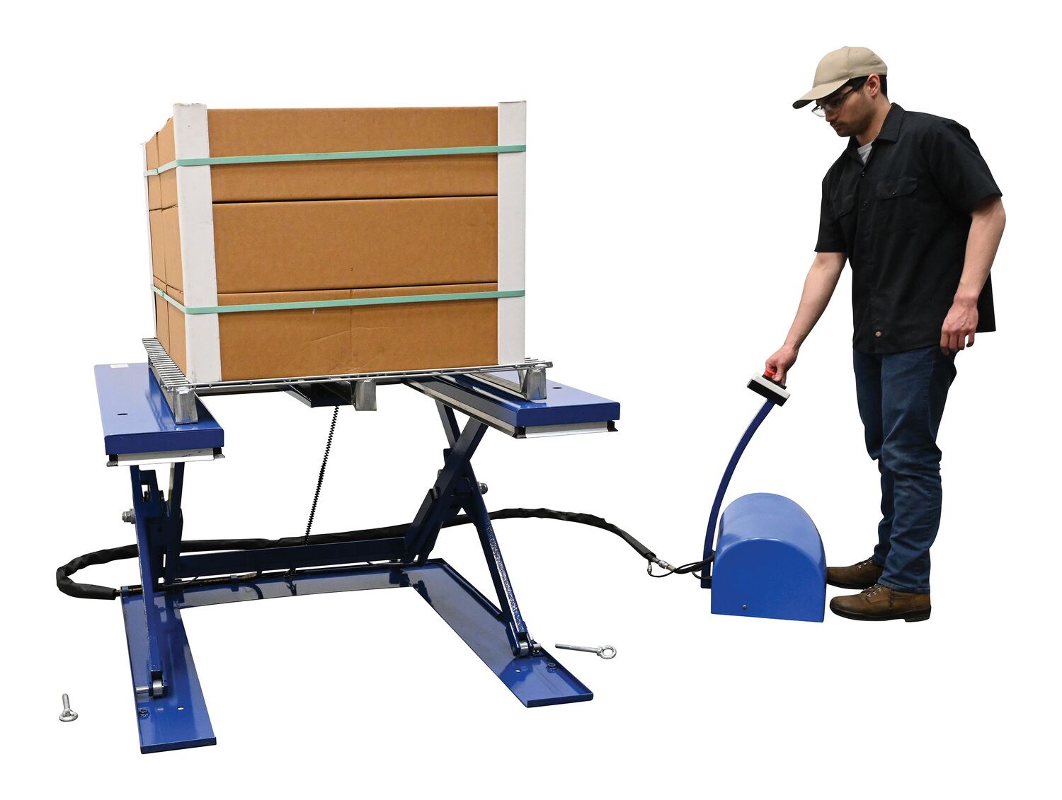 The low profile electric lift tables are ideal for manufacturing and distribution facilities. The unique, steel constructed "E" design provides a center support beam to prevent the lifted product from deflecting downward in the center. Numerous protective features include electric toe guards, velocity cylinders, and emergency stop buttons, providing personnel with the utmost safety. An external power pack is equipped with a pressure relief valve which prevents overloading while controlling lowering speed. To raise and lower the unit, simply utilize the "up and down" push button design on the 24V control box for precise ergonomic positioning of product.