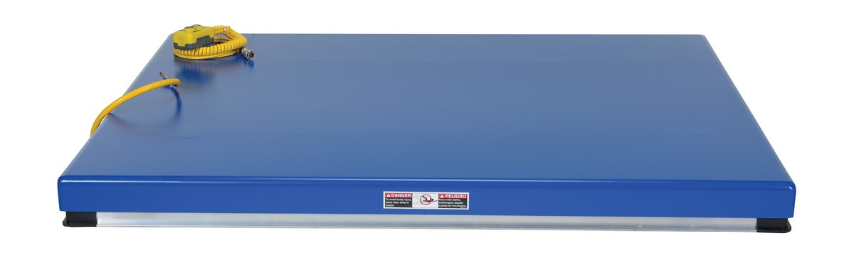 Steel Electric Hydraulic Lift Table 48 In. x 60 In. 2000 Lb. Capacity BlueThe electric hydraulic scissor lift table is used by all types of manufacturing and warehouse facilities. Safety features include a patented pinch point perimeter toe guard to protect pinch points while lowering the table, fused push button control, internal safety velocity fuse to maintain platform height in the event of hose or fitting failure, integral maintenance prop, adjustable upper travel limit switch to stop the table at maximum height, and displacement-style hydraulic cylinders for maximum strength. It also features a pressure plated pump, manifold system, and state-of-the-art lifetime lubricated bearings. The standard 56 frame electric motor is fully enclosed with additional voltage options available. Contact factory if platform dimensions are crucial.