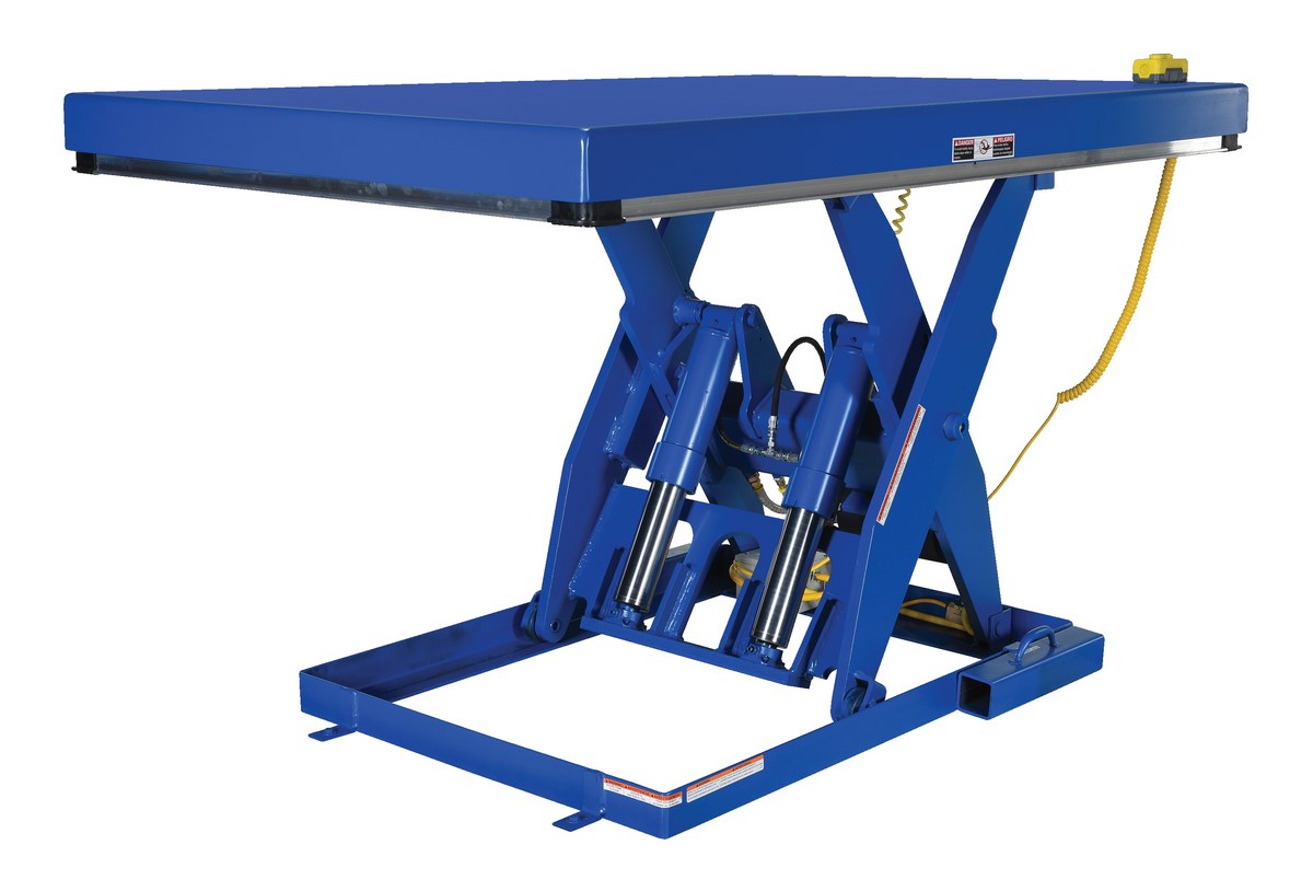 Steel Electric Hydraulic Lift Table 48 In. x 72 In. 6000 Lb. Capacity BlueThe electric hydraulic scissor lift table is used by all types of manufacturing and warehouse facilities. Safety features include a patented pinch point perimeter toe guard to protect pinch points while lowering the table, fused push button control, internal safety velocity fuse to maintain platform height in the event of hose or fitting failure, integral maintenance prop, adjustable upper travel limit switch to stop the table at maximum height, and displacement-style hydraulic cylinders for maximum strength. It also features a pressure plated pump, manifold system, and state-of-the-art lifetime lubricated bearings. The standard 56 frame electric motor is fully enclosed with additional voltage options available. Contact factory if platform dimensions are crucial.