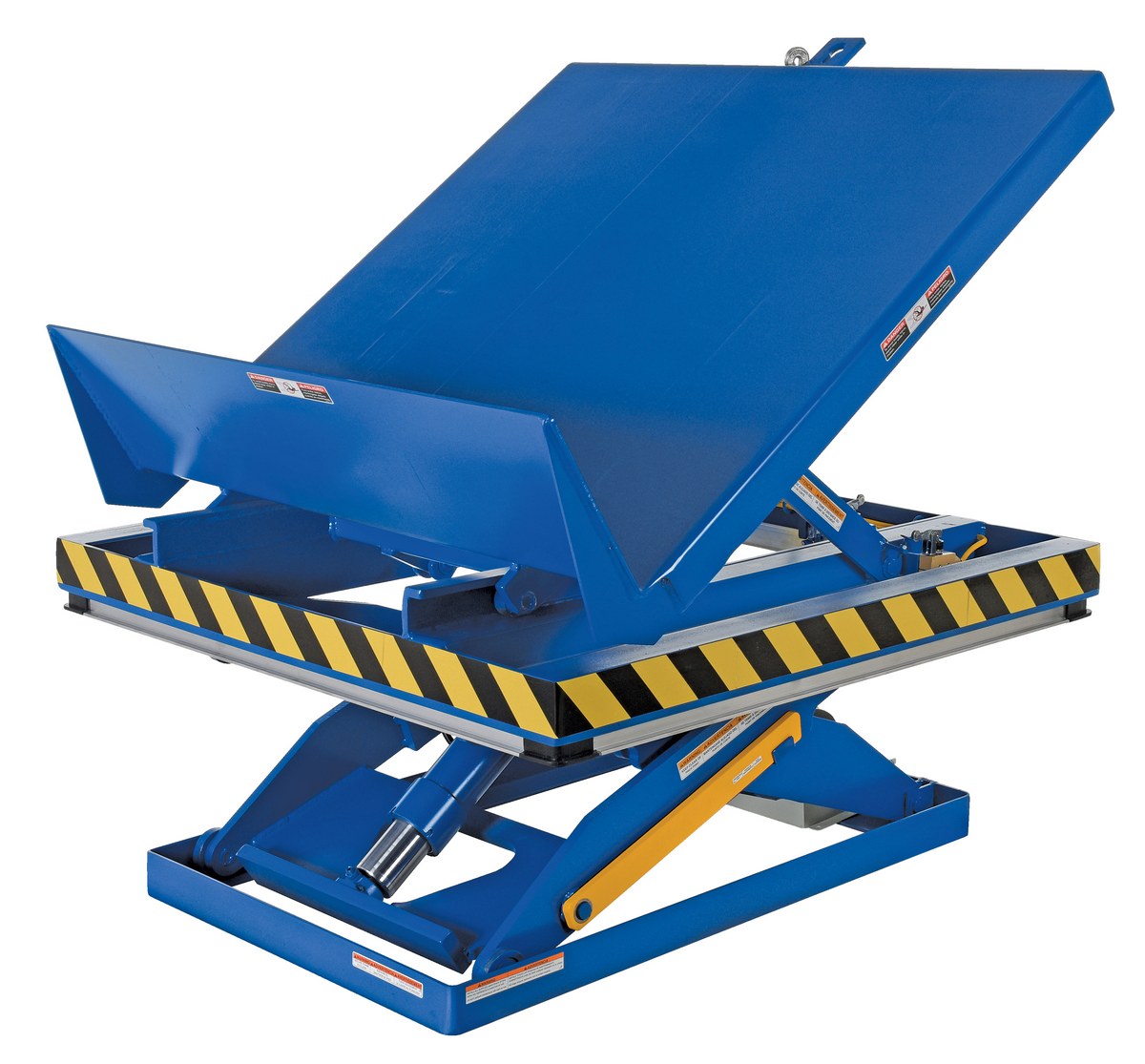 Steel Lift and End Tilt Scissor Table 48 In. x 48 In. 3000 Lb. Capacity BlueThe lift and tilt scissor lift performs both lifting and tilting operations. There is a restraining chain and lip to keep the load in place during tilting. Safety features include an electric toe guard to protect workers from pinch points during lowering of the table, velocity fuses to hold platform position in the event of a hose or fitting failure, four (4) push-button hand pendent control, upper limit switch to stop travel at maximum height and reduce motor wear, and maintenance prop. The end tilt is standard with a side tilt available. There is optional accordion skirting available for both the lifting and tilting portions of the table.
