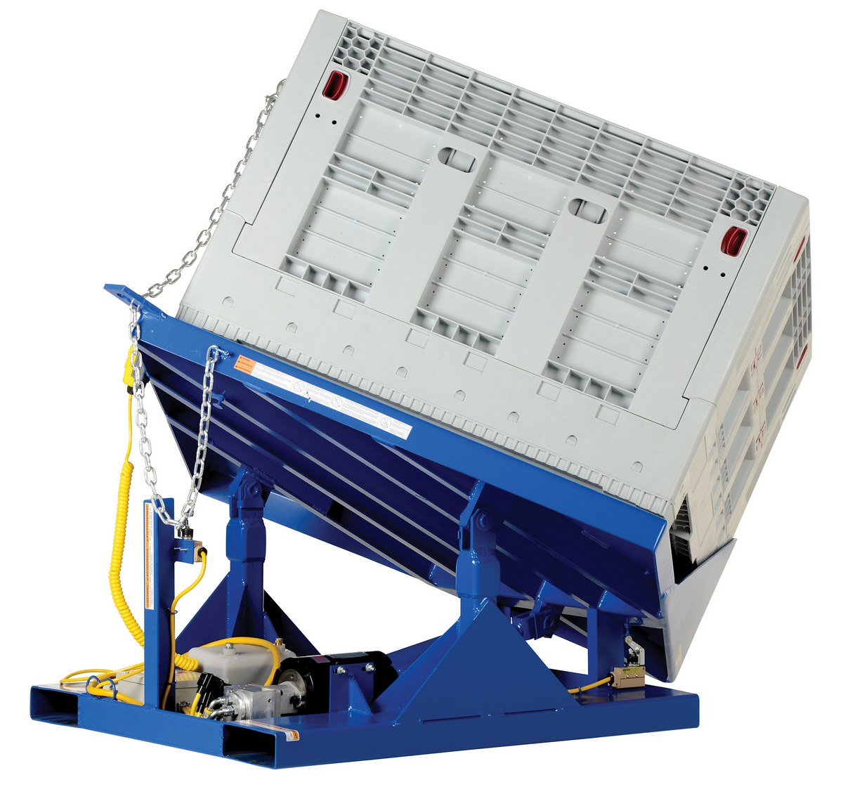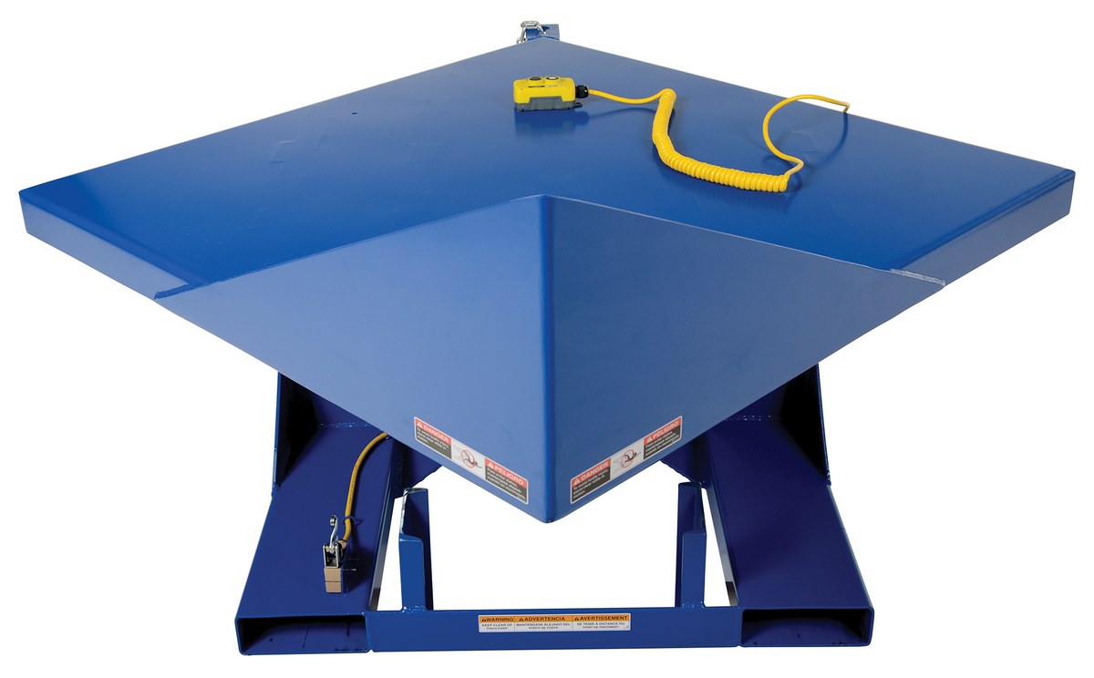 Steel Electric Hydraulic Corner Tilters 48 In. x 48 In. 4000 Lb. Capacity BlueThe electric/hydraulic corner tilter reduces repetitive motion injuries and fatigue while making your job easier and faster. It's designed to corner tilt pallets, crates, boxes, or baskets. The AC powered motor has a push button control with additional voltage options available.