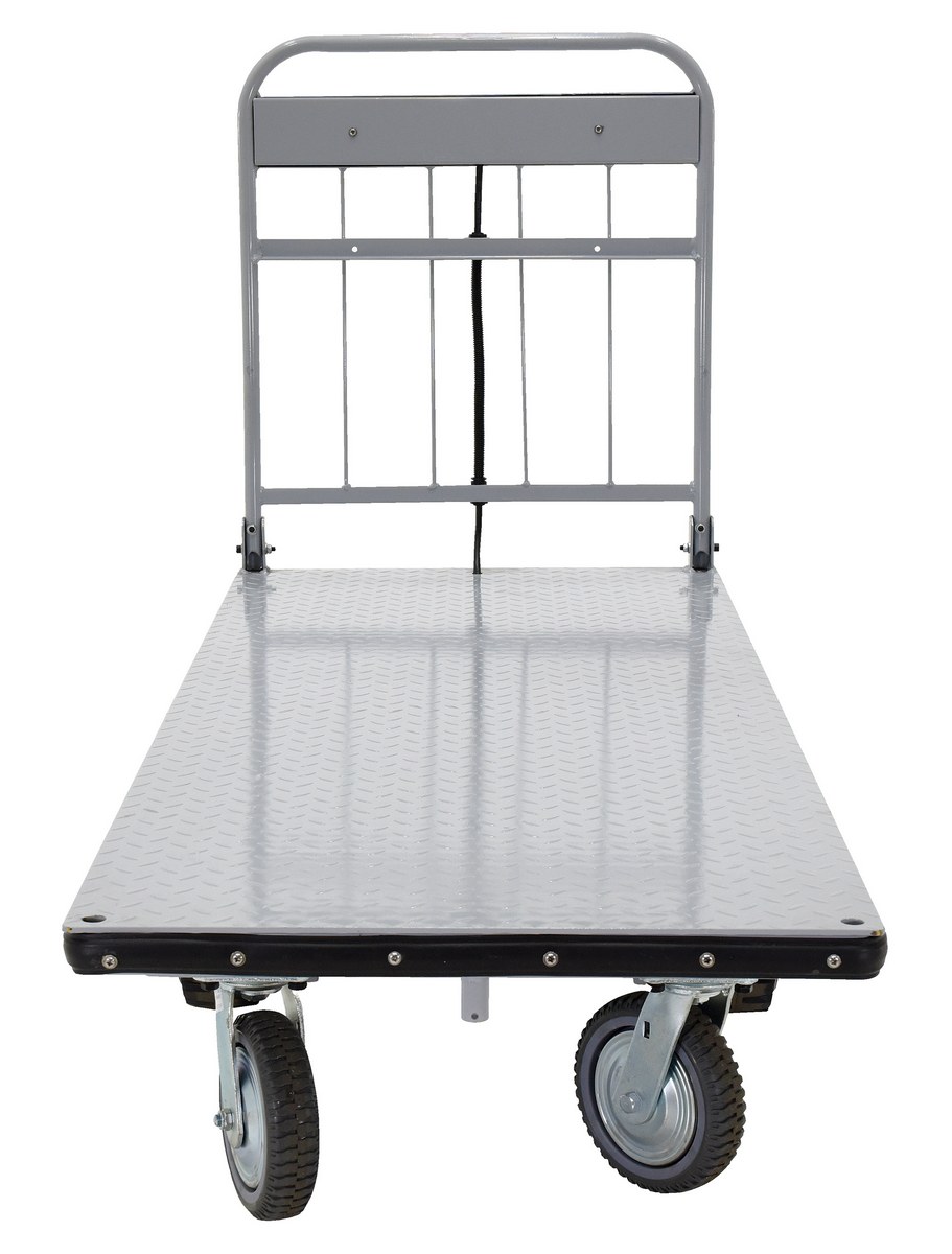 Steel Electric Material Handling Cart No Sides 28 In. x 72 In. 2000 Lb. Capacity GrayElectric material handling carts are ideal for moving heavy loads safely and easily throughout warehouses, offices, schools, and hospitals and incorporates a multitude of features to make light work of heavy loads. Reduce injury and increase productivity with these high quality carts. Features an 800W electric drive motor with (2) two 12V batteries for power and on-board 115V AC battery charger. The handle includes forward and reverse throttle control levers, an emergency reverse switch, a battery level gauge, and a slow/fast speed switch. Pinpoint turning is accurate with the mid-axle drive feature.