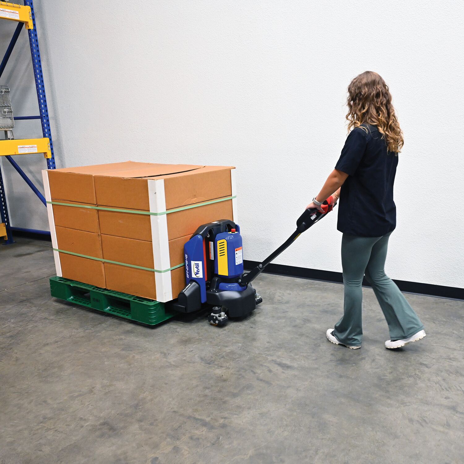 An electric pallet truck is the perfect upgrade from the standard manual design. This functional approach minimizes manual labor and maximizes efficiency when moving products and goods. Speed adjustments as well as raising/lowering forks can be modified without the users' hands leaving the functional handle. Unit is powered by a lithium ion battery for continuous consistent use. Forks are powder coated for a baked in added toughness. Horn is also included.