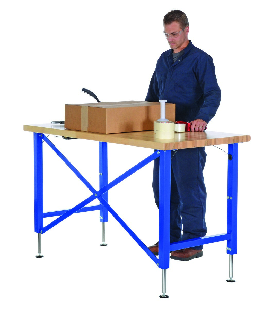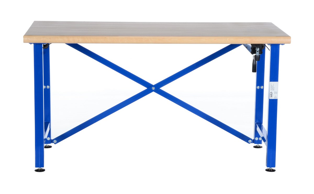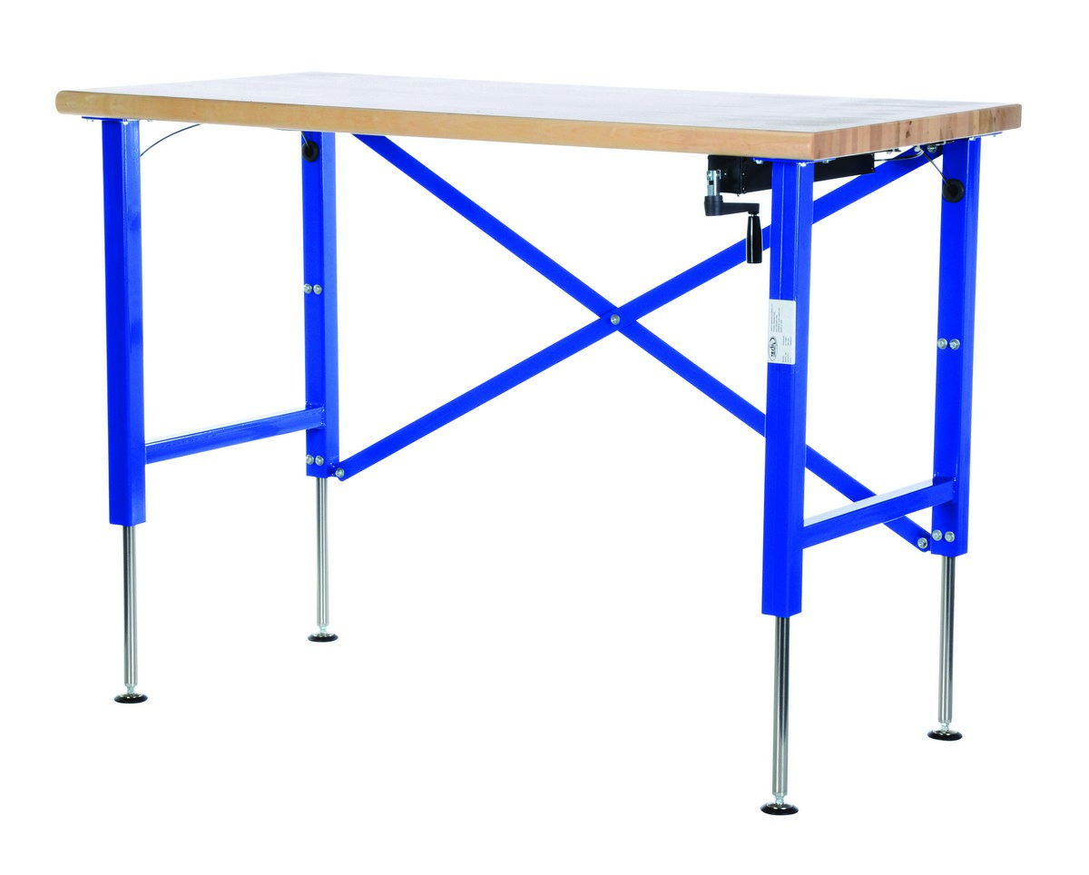 Steel/Wood Manual Adjustable Ergonomic Work Bench 60 In. x 30 In. 750 Lb. Capacity Blue/TanThe manual adjustable Ergonomic Work Bench raises material to an ergonomic working height. A fold away hand crank is located directly under the platform for easy raising and lowering. The hydraulic system will raise platform evenly.