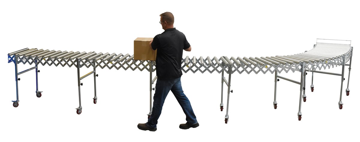 Expandable roller conveyor is the perfect asset for packaging and distributing facilities. The conveyor provides the user an ergonomically friendly way to transfer goods while minimizing the bending and twisting during shipping and handling. A strong construction provides strength for transferring large awkward products. The conveyor can be expanded to reach greater distances between packaging points. Once finished it can be retracted to fit in a condensed area.