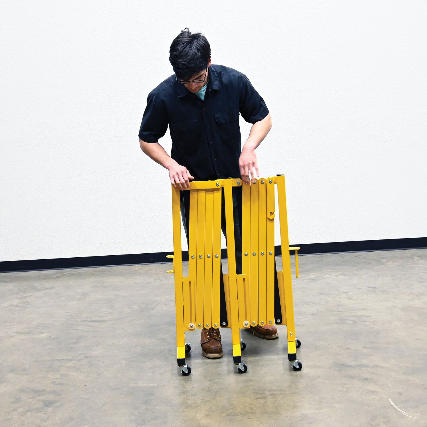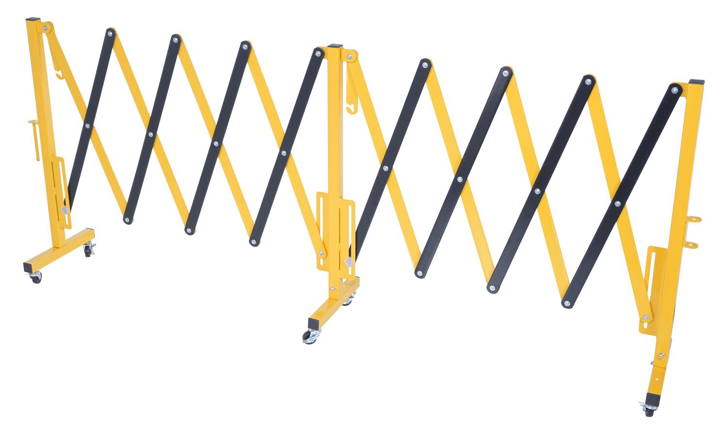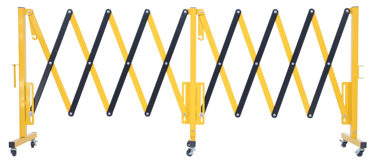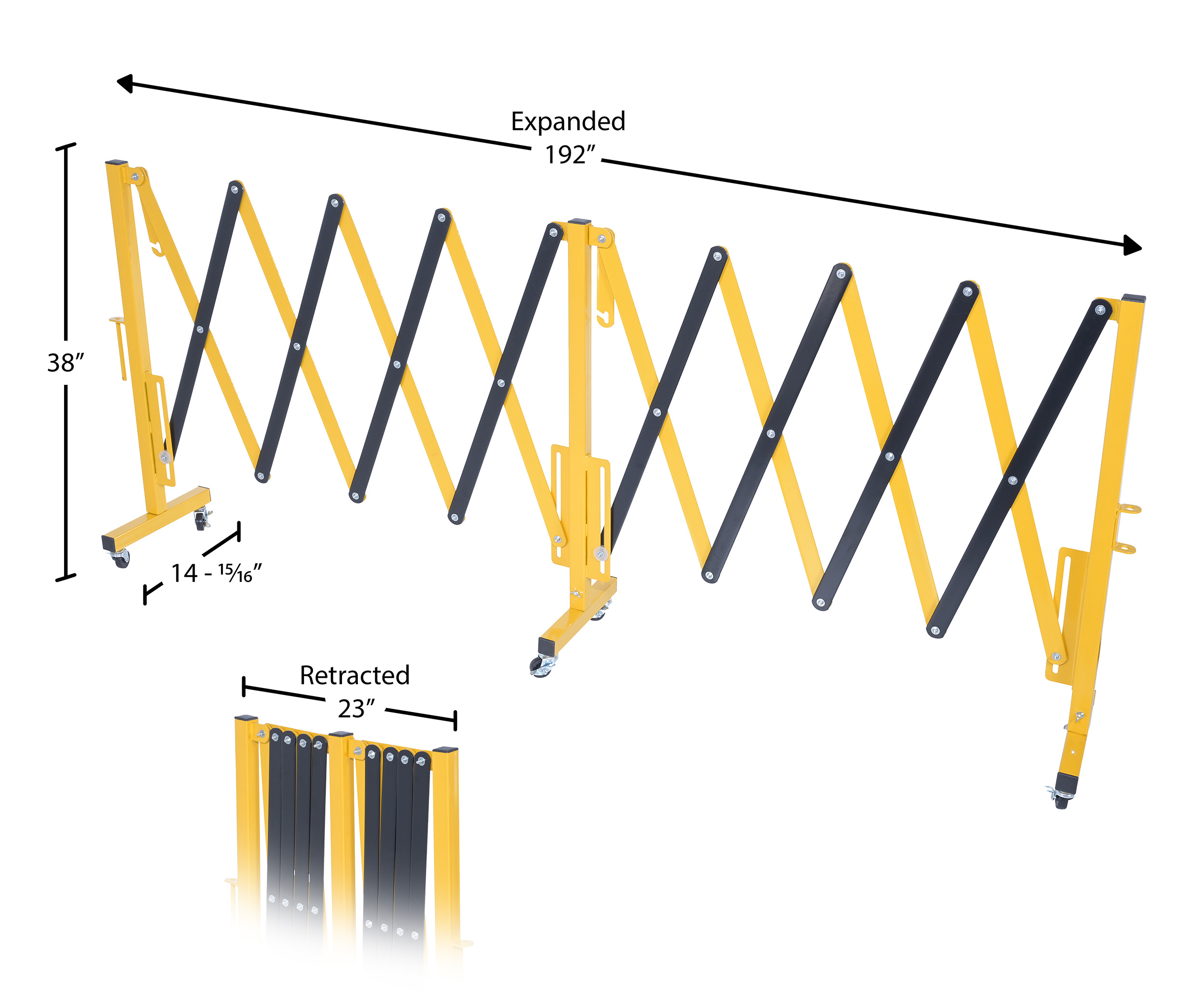 Steel Expand A Gate 192 In. Length Yellow/BlackExpand-A-Gate is designed to block areas where restrictions are in place. The scissor design can be expanded to fit a variety of different sized areas, while also being compacted for a small storage footprint. Rolls smoothly on six swivel casters. Powder coat finish for baked in added toughness. Ships knocked down.