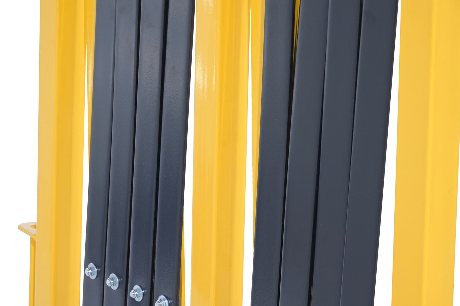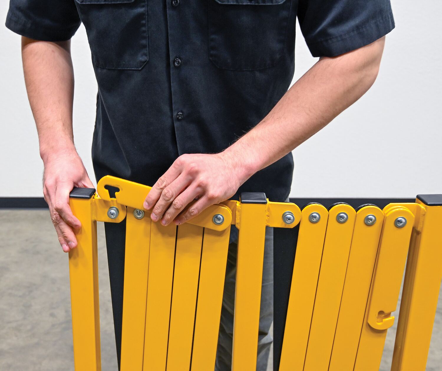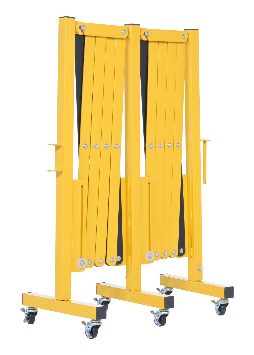 Steel Expand A Gate 192 In. Length Yellow/BlackExpand-A-Gate is designed to block areas where restrictions are in place. The scissor design can be expanded to fit a variety of different sized areas, while also being compacted for a small storage footprint. Rolls smoothly on six swivel casters. Powder coat finish for baked in added toughness. Ships knocked down.