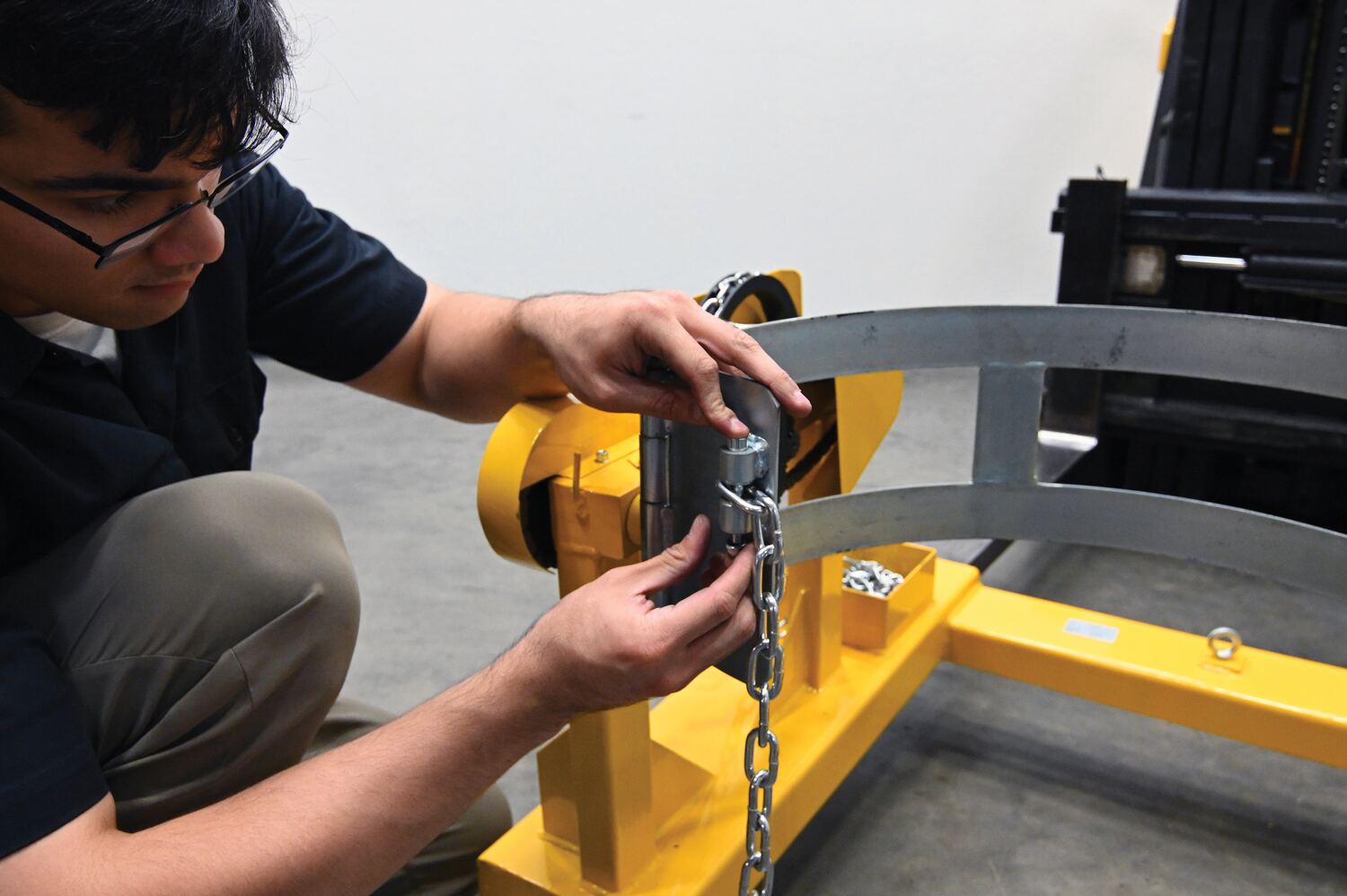 This fiber drum adapter is designed to hold and support fiber and plastic drums. Comes complete with both an adjusting arm and a high strength nylon strap so thirty (30) gallon and fifty-five (55) gallon drums can be used with listed stackers and carrier/rotators.