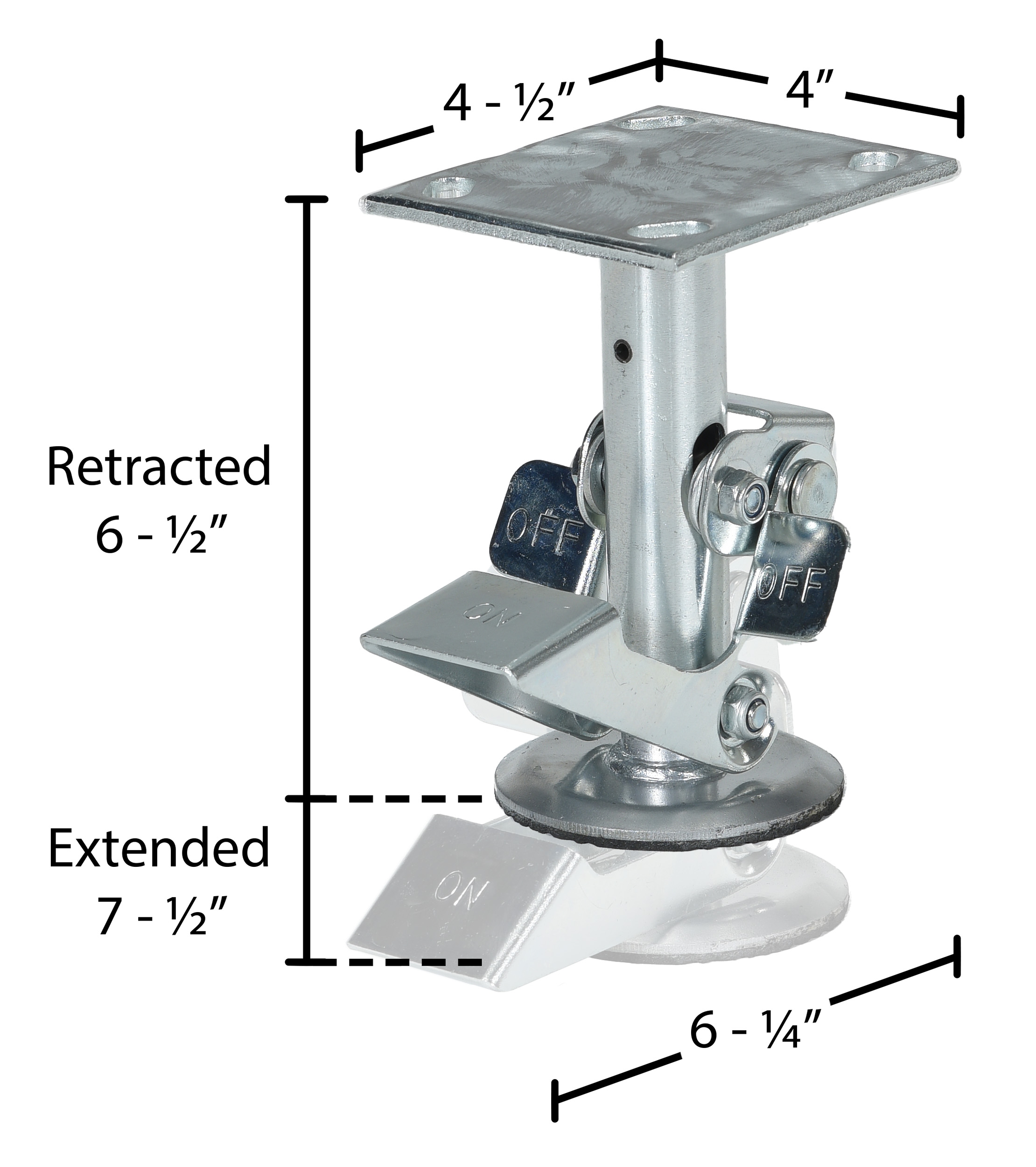 | Mounting Height (in.): 7-1/4 | Retracted Height (in.): 6-1/2 | Used with Caster Size (in.): 6 |