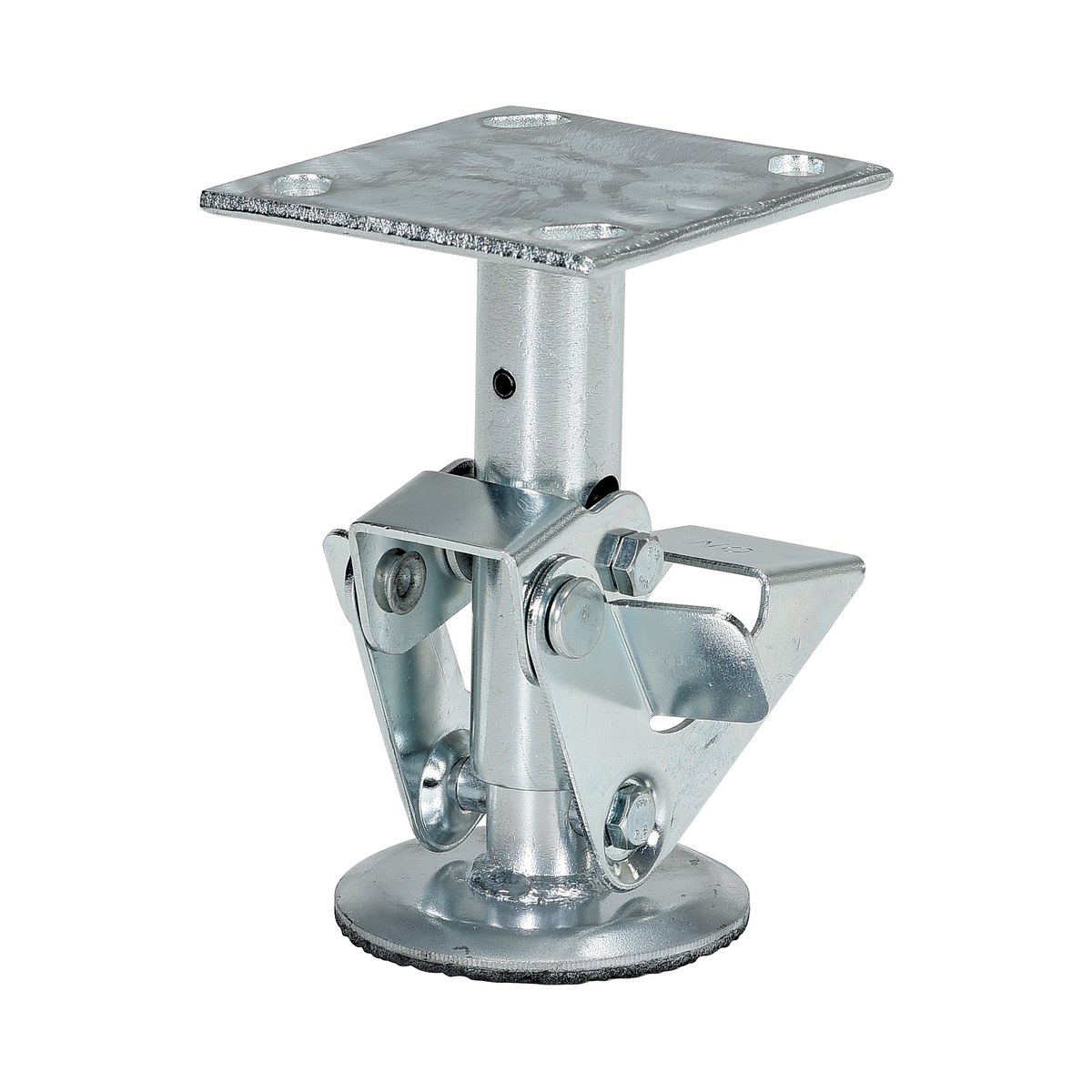 Galvanized Steel Top Mount Floor Lock 6-1/2 to 7-1/4 In. Height GrayFloor locks may be used on platform trucks, fixture dollies, or equipment with casters. Simple foot pressure immobilizes equipment. Locks when large friction face is pressed against the floor. To release simply kick release rod. Brake is independent of casters and can be installed to any convenient location on the cart. Vertical mounting plate designed to mount to sides of carts and other portable products. The spring loaded pad accommodates uneven floors. Units mount with pad 1." off the floor when retracted.