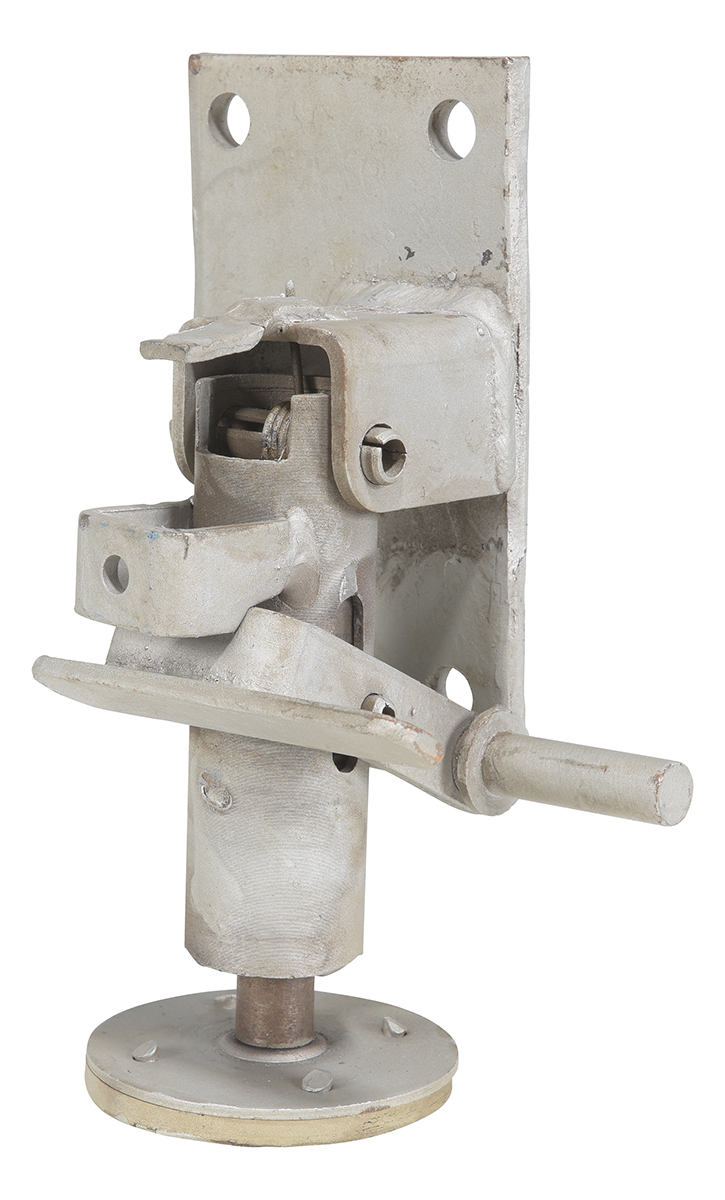 Steel Floor Lock 7 In. to 8-3/16 In. Height SilverFloor locks may be used on platform trucks, fixture dollies, or equipment with casters. Simple foot pressure immobilizes equipment. Locks when large friction face is pressed against the floor. To release, simply kick release rod. Brake is independent of casters and can be installed to any convenient location on the cart. Vertical mounting plate is designed to mount to sides of carts and other portable products. The spring loaded pad accommodates uneven floors.