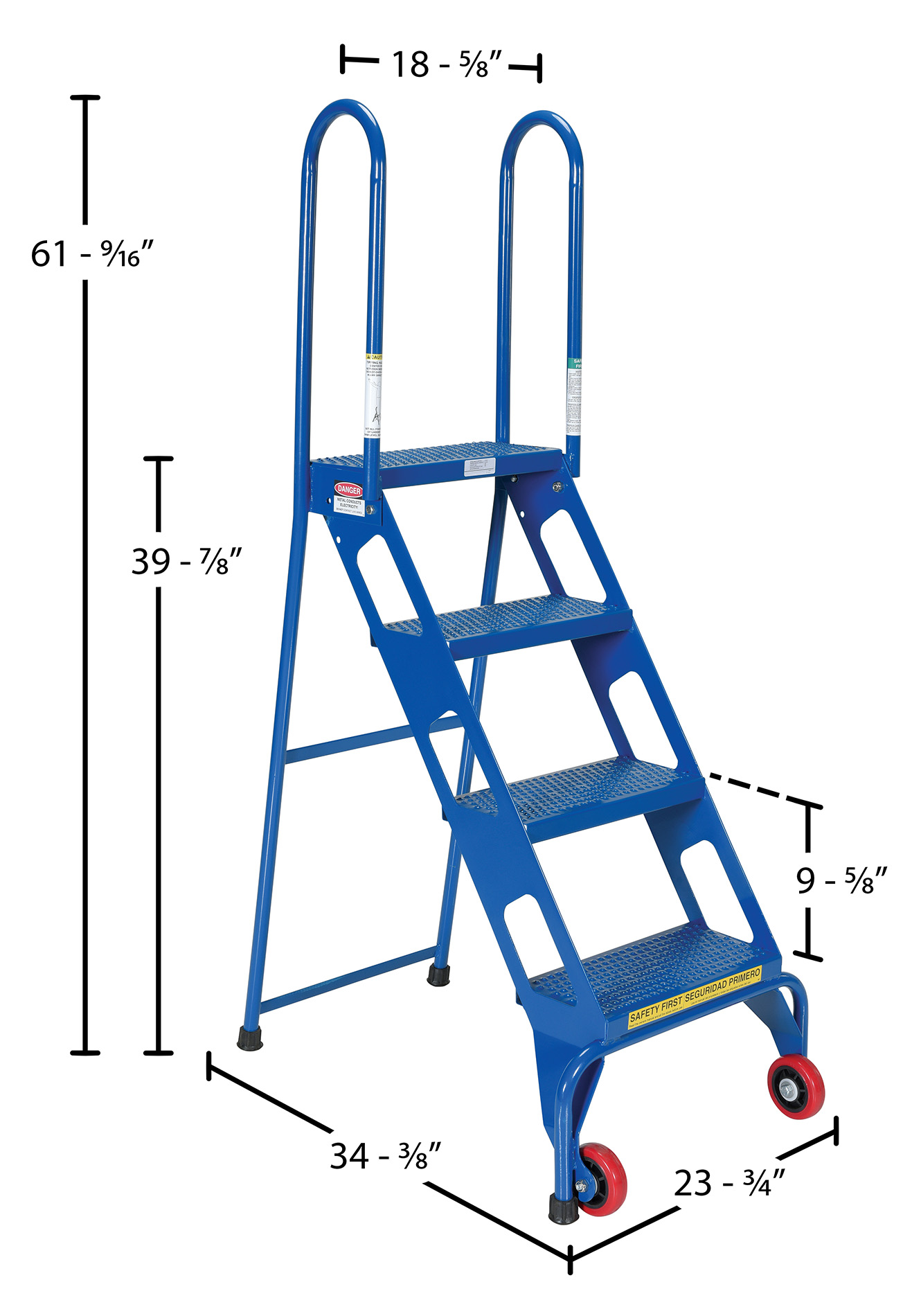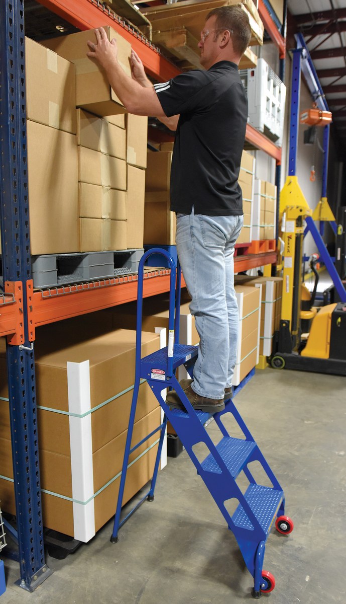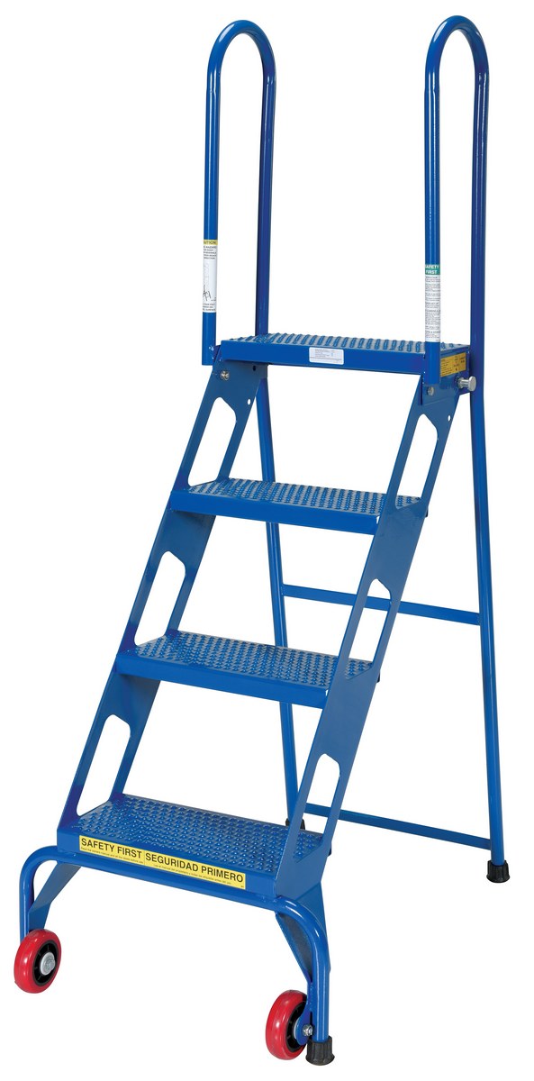Steel Folding Ladder with Wheels 4 Step 350 Lb. Capacity BlueThe folding ladder with wheels has a locking foldable design that saves on storage space when ladder is not in use. Ladder folds after unlocking spring-loaded detent pin. Once unit is folded, tilt back on wheels for easy portability. Ladder is carbon steel. The steps are perforated to provide a non-slip surface.