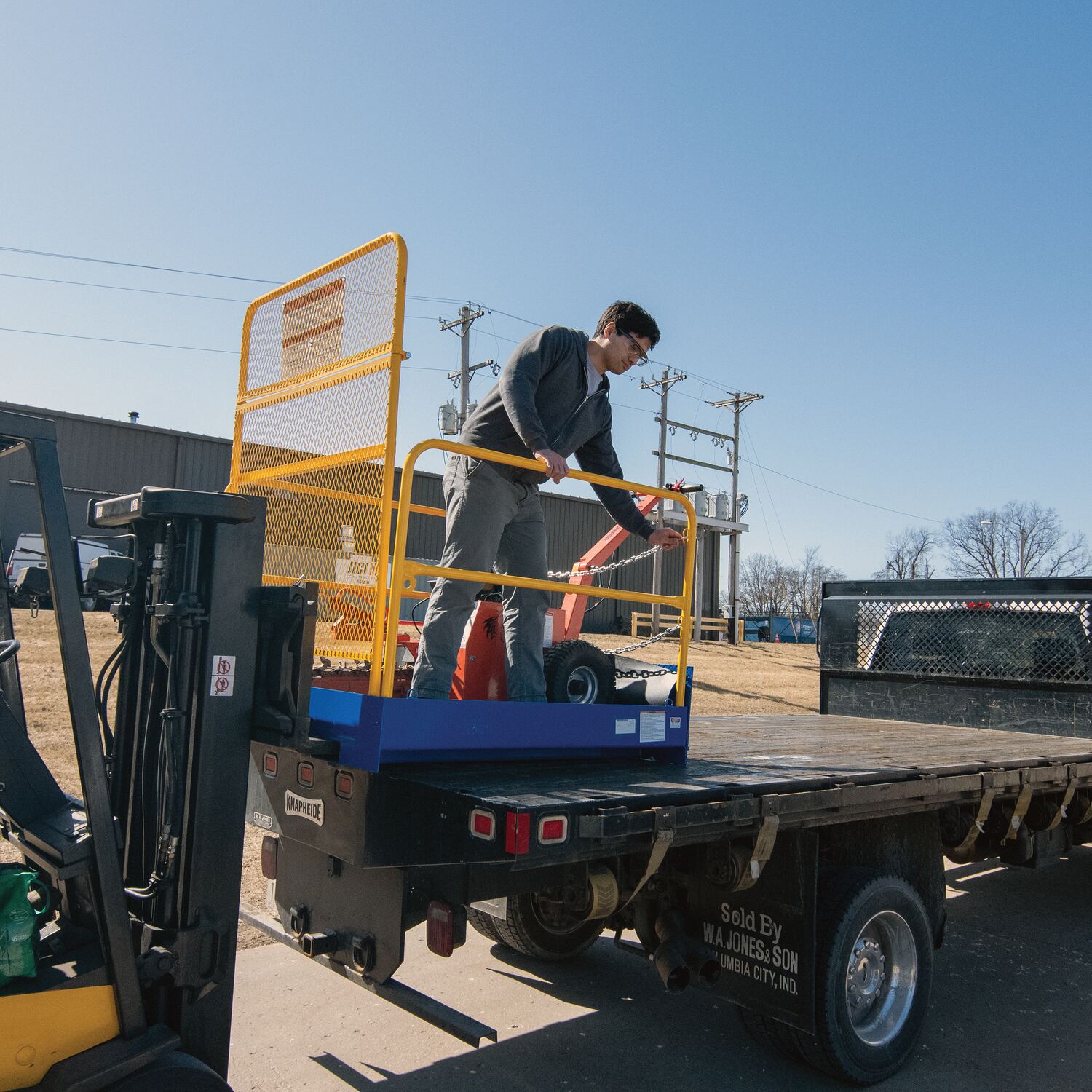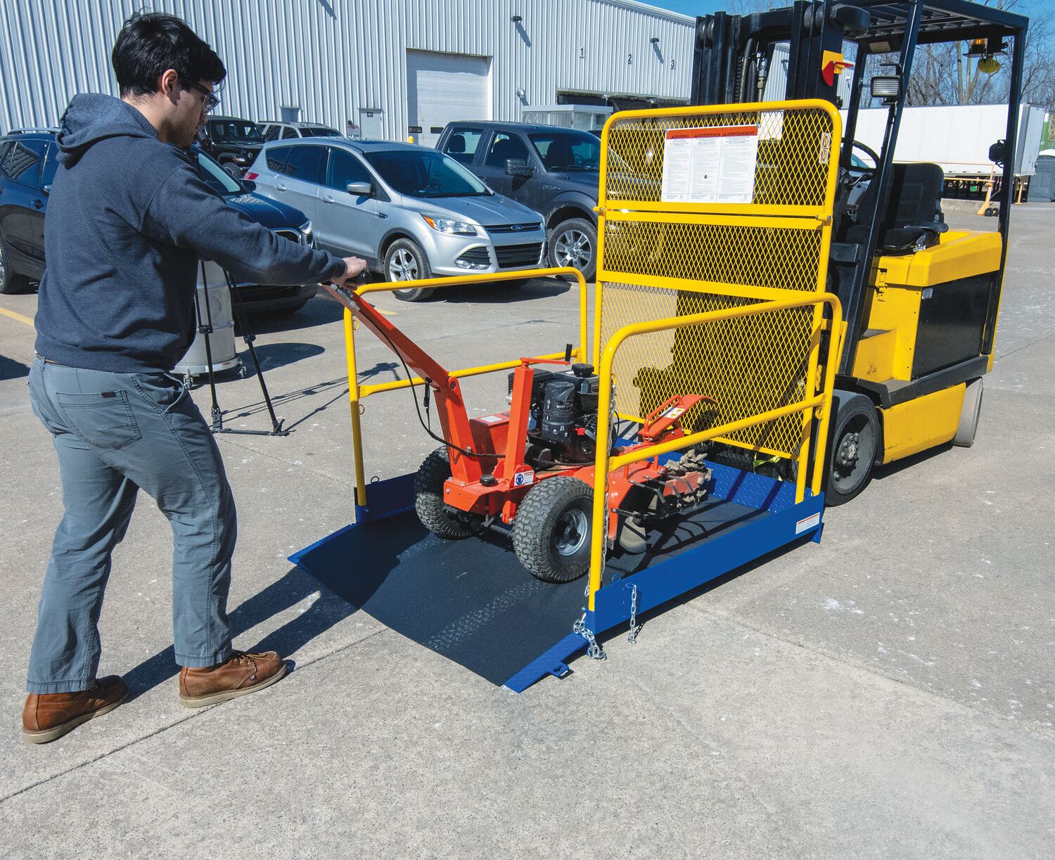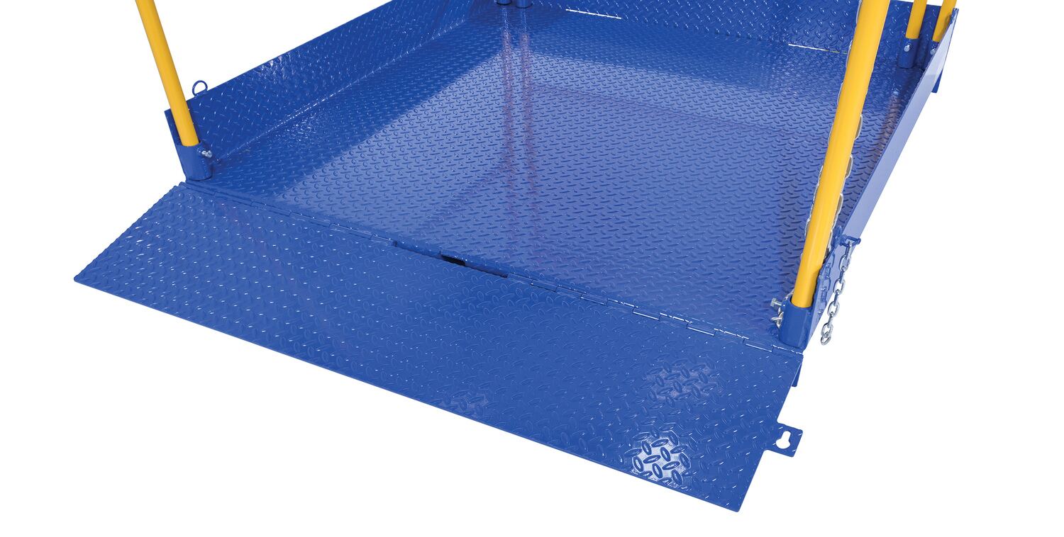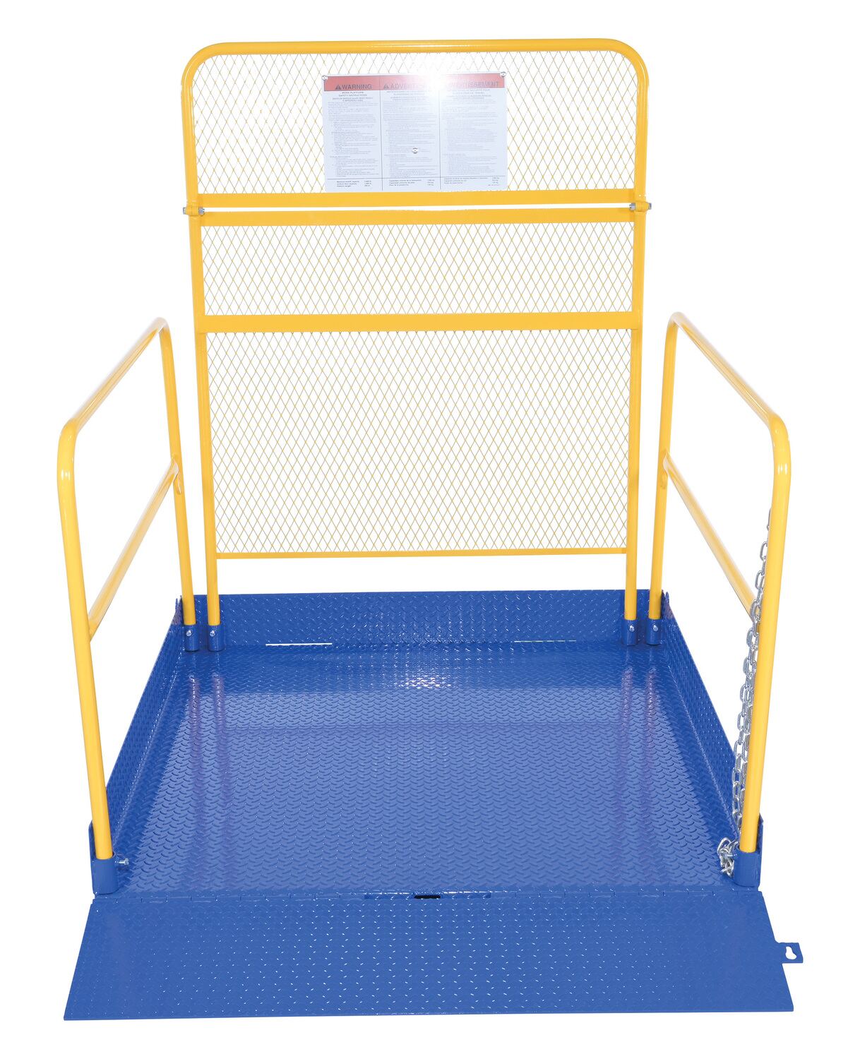 Steel Economical Portable Loading Platform with Handrails 54 In. x 54 In. 2000 Lb. Capacity BlueThis loading platform for fork trucks allows fork trucks to load/unload items into trucks and trailers. Maximum uniform weight capacity is dependent on fork truck capacity. Includes fold-down lip to help with transition. Side guard toe boards. Four (4) tie-down rings are included for securing equipment (tie downs not included). Diamond tread plate floor for extra traction. Handrails on two (2) sides, back mesh screen and chain to secure open end. safety strap (included) to secure platform to fork truck. Steel construction with blue baked-in powder-coated toughness.
