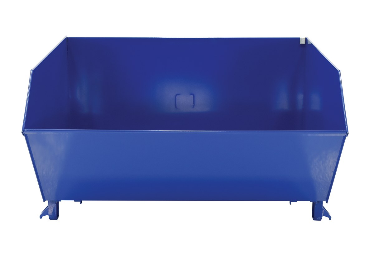 Steel Light Duty Low Profile Self Dumping Hopper 1 Cubic Yard 2000 Lb. Capacity BlueThe Light Duty Low Profile 90 degree self-dumping steel Hopper feature a full ninety (90) degree dump angle with a cushioned rubber bumper stop. The low profile design is essential for convenient loading. Dumping with a fork truck is quick and simple. A cable is pulled from the seat of the fork truck to dump the hopper. The unit returns to an upright and locked position when lowered to the ground. Fork pockets are 22" long and are capped on the end to allow for 90 degrees dump. The included safety restraint/chain must be securely attached to the lift truck carriage without slack. Models with same overall width may be stacked. For example, models H-25 may be stacked with H-50’s, the H-100’s can be stacked with H-150’s, while the H-200 hoppers can only be stacked with other H-200 series models. Never stack hoppers more than 3 high.