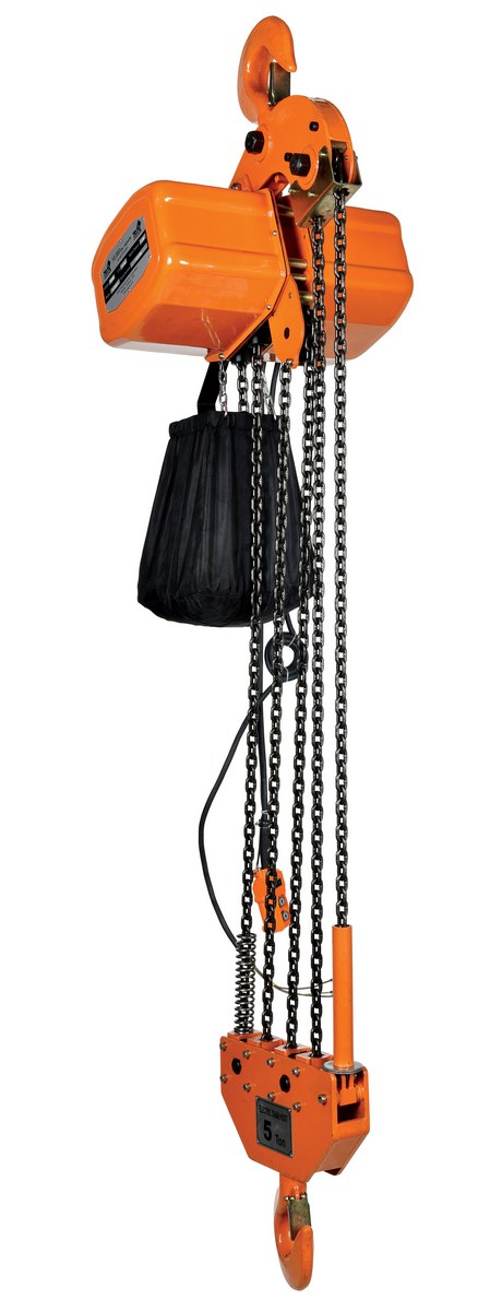 Steel Economy Chain Hoist with Chain Container 1 Phase 10000 Lb. Capacity OrangeThis compact hoist features a high efficiency motor with convenient push-button operation. Single phase power available. Unit is dust and water resistant, load limit fitted. Chain container included.